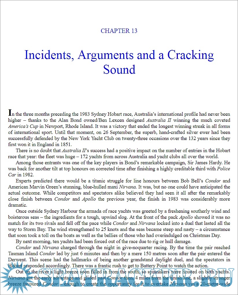 Description: Rob Mundle is a well known competitive sailor, journalist, media commentator, and author of eighteen books, including maritime history bestsellers. His book "Fatal Storm", on the tragic 54th Sydney Hobart Yacht Race was published in six languages. This book is the 76-years story, from the beginning to the present day, of the famous Sidney-Hobart, a 630 miles race that involves amateurs as well as professionals and sailing celebrities like John Illingworth, among others. It is also a story of yachting evolution, from wooden classics RORC anc CCA rules to carbon fibre supermaxis, and a test for boat building innovation.