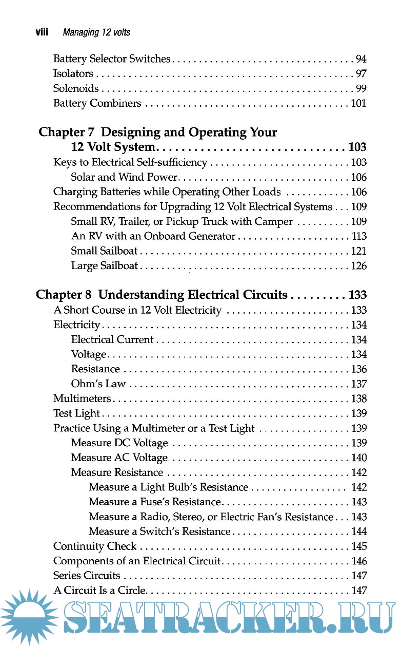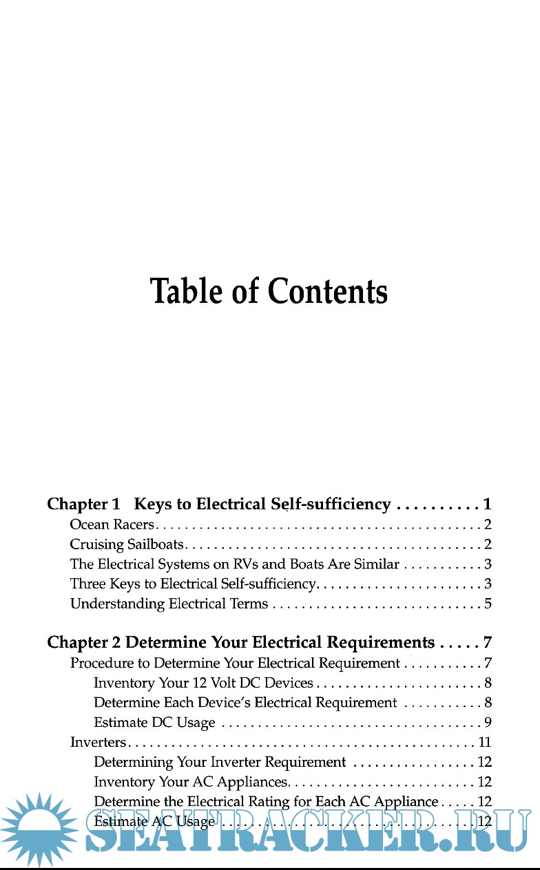 Year: 2002 Language: english Author: Harold Barre Genre: Manual Publisher: Summer Breeze Publishing Edition: 2nd ISBN: 9780964738621 Format: PDF Quality: eBook Pages count: 240 Description: This manual is about how to upgrade, operate and troubleshoot a 12-volt systems with emphasis on understanding what may be wrong with a system and how to improve it with a multi-stage charging system. The author, through diagrams and clear, concise writing, lead the reader to understand, operate, upgrade, repair the 12 V electrical system, how to change parts, calculate the amount of charge batteries contain and power consumption, and how to recharge them properly.