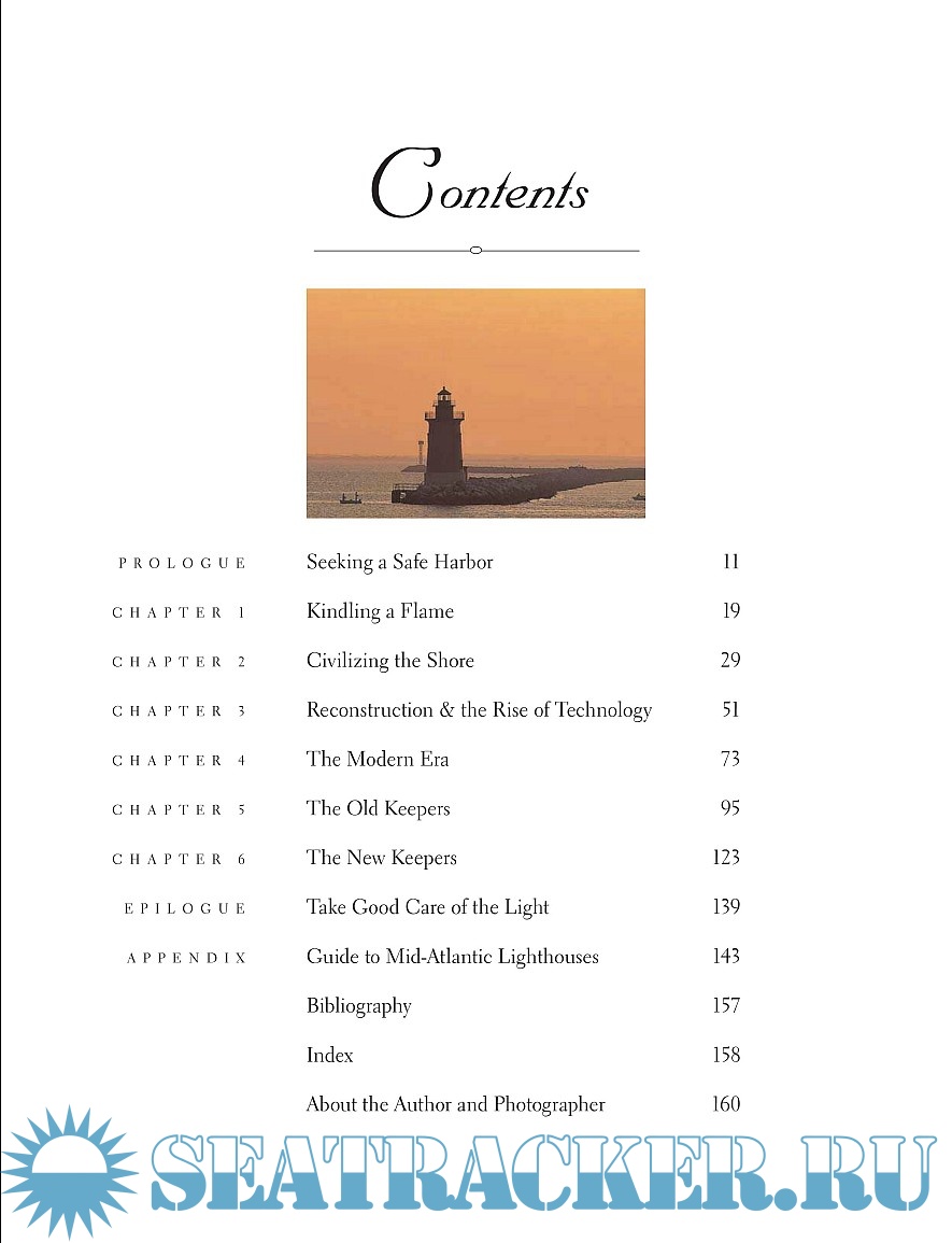 The prologue combines the history of Delaware's Harbor of Refuge Lighthouse with an interview of a former keeper. Other chapters deal with such early American lighthouses, women keepers, fog signals, and lightships. The book ends with a guide to mid-Atlantic lighthouses: New York, New Jersey, Delaware, Maryland and Virginia. Each lighthouse has a short paragraph dedicated to.