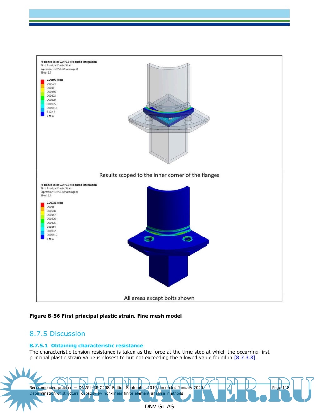 Year: 2020 Language: english Author: DNV GL AS Genre: Methodological guide Publisher: DNVGL Edition: September 2019 - Amended January 2020 Format: PDF Quality: eBook Pages count: 150 Description: 1.1 General This document is intended to give guidance on how to establish structural resistance by use of nonlinear finite element (FE) methods. It deals with determining the characteristic resistance of a structure or part of a structure in a way that fulfils the requirements to ultimate strength in DNV GL standards. Nonlinear effects that may be included in the analyses are material and geometrical nonlinearity, contact problems, etc. The characteristic resistance should represent a value that meets the requirement that there is less than 5% probability that the resistance is less than this value. This definition of characteristic resistance is similar to what is required by many other structural standards that use the limit state safety format. Recommendations in this document are expected to be valid for determination of capacities to be used with such standards. 1.2 Objective The objective of this recommended practice is that analyses carried out according to the recommendations given in this document will lead to a structure that meets the requirements to the minimum safety margin in the governing structural standard. This document is not intended to replace formulas for resistance in design standards for the cases where they are applicable and accurate, but to present methods that allow for using nonlinear FEmethods to determine resistance for cases that is not covered by traditional standards. 1.3 Scope This recommended practice is meant to supplement structural design standards for offshore steel structures and gives recommendation on how to determine the structural capacity by the use of nonlinear finite element analysis. 1.4 Validity The document is valid for marine structures made from structural steels meeting requirements to offshore structures with yield strength of up to 500 MPa. The recommendations presented herein are adapted to typical offshore steels that fulfil the requirements specified in DNVGLOSC101 /9/ or an equivalent offshore design standard. The specified requirements are made under the assumption that the considered structure is operating under environmental conditions that are within the specifications of the applied offshore standard. If the offshore unit is operating outside these specifications, the failure criterion presented in this recommended practice can only be utilized if it can be documented that both the weld and parent material have sufficient toughness in the actual environmental conditions. This recommended practice is concerned only with failure associated with extreme loads. Failure due to repeated loading from moderate loads (fatigue) needs to be checked separately. See DNVGLRPC203 /11/.
