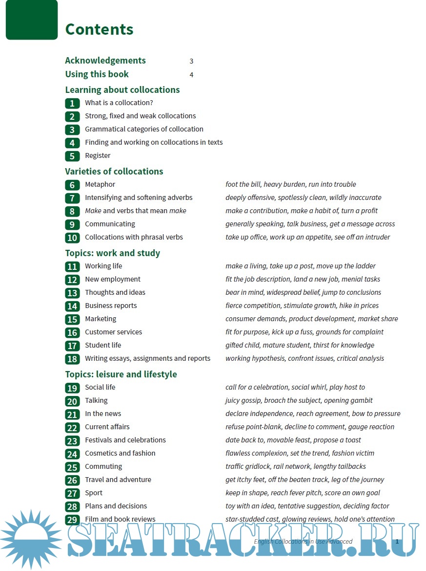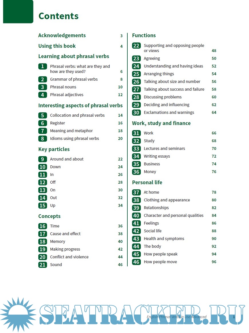 Interesting aspects of more advanced phrasal verbs, dealing with such important issues as collocation, register and metaphor are given. As these are themes that are returned to throughout the book, course works through these units before progressing to other more specific units.
