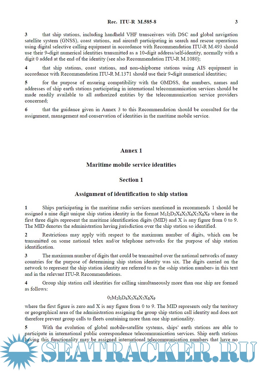 Description: This ITU Recommendation provides guidance to administrations for the assignment and conservation of identities for the maritime mobile service. Limitations and constraints for assignments regarding satellite services of the GMDSS are here described.