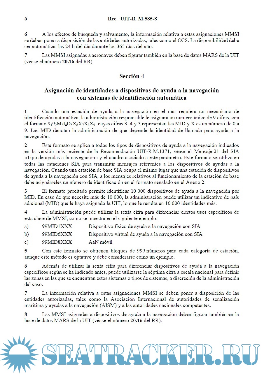 Year: 2019 Language: multilingual Author: ITU Genre: Methodological guide Publisher: ITU Format: PDF Quality: eBook Pages count: 11 Description: This ITU Recommendation provides guidance to administrations for the assignment and conservation of identities for the maritime mobile service. Limitations and constraints for assignments regarding satellite services of the GMDSS are here described. Annex 1 in particular describes formats for maritime mobile service identities (MMSI) of ship stations, coast stations, SAR aircrafts and other safety-related communications, automatic identification system (AIS) aids to navigation, and craft associated with a parent ship. Annex 2 describes formats for identification of other maritime devices, such as handheld VHF transceivers with digital selective calling (DSC) and global navigation satellite system (GNSS), AIS-search and rescue transmitter (AIS-SART), man overboard (MOB) and emergency position indicating radio beacon (EPIRB)-AIS. Finally, Annex 3 provides specific guidance to administrations for the assignment, management and conservation of identity resources for the maritime mobile service. This guidance further instructs administrations on methods for the reuse of MMSI assignments, particularly for the reuse of those with three trailing zeroes. Additional info: Folder with three documents of the same content, in English, Russian, Spanish.