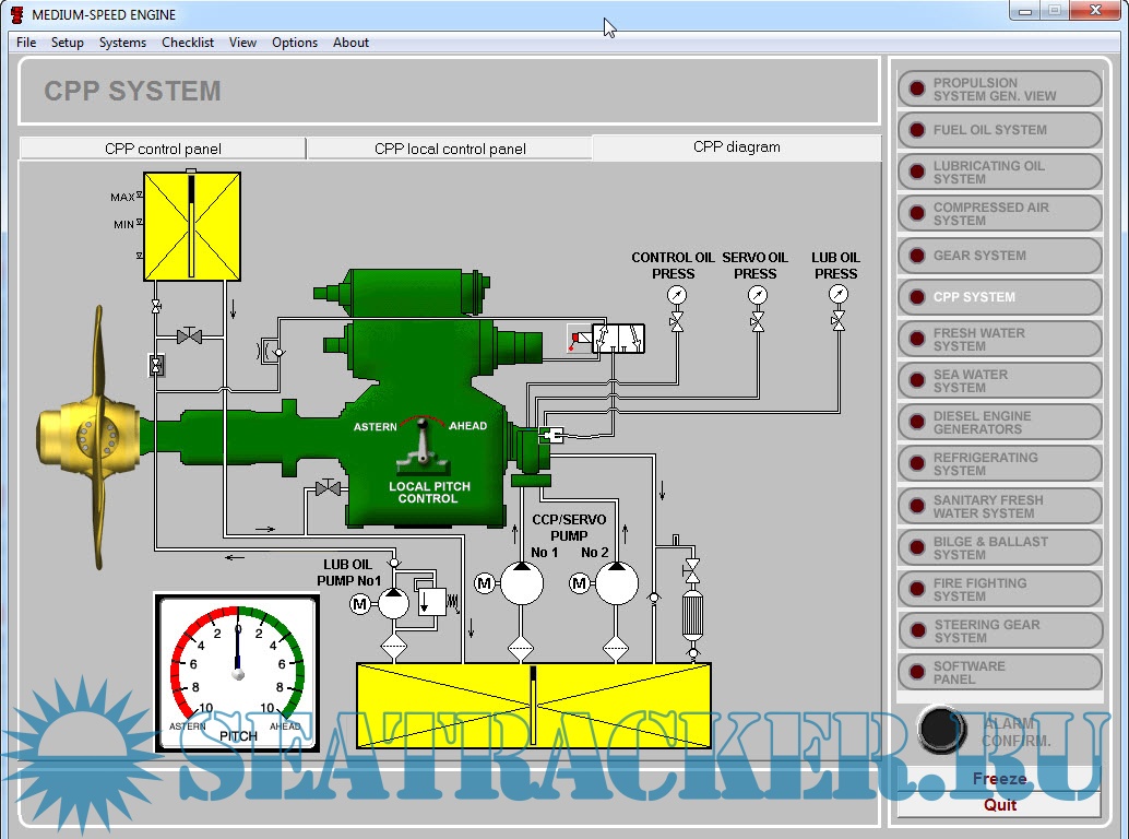 - familiarization with the basic engine room installation (compressed air system, fresh and sea water cooling system, lubricating and fuel oil system, gear and CPP hydraulic system);