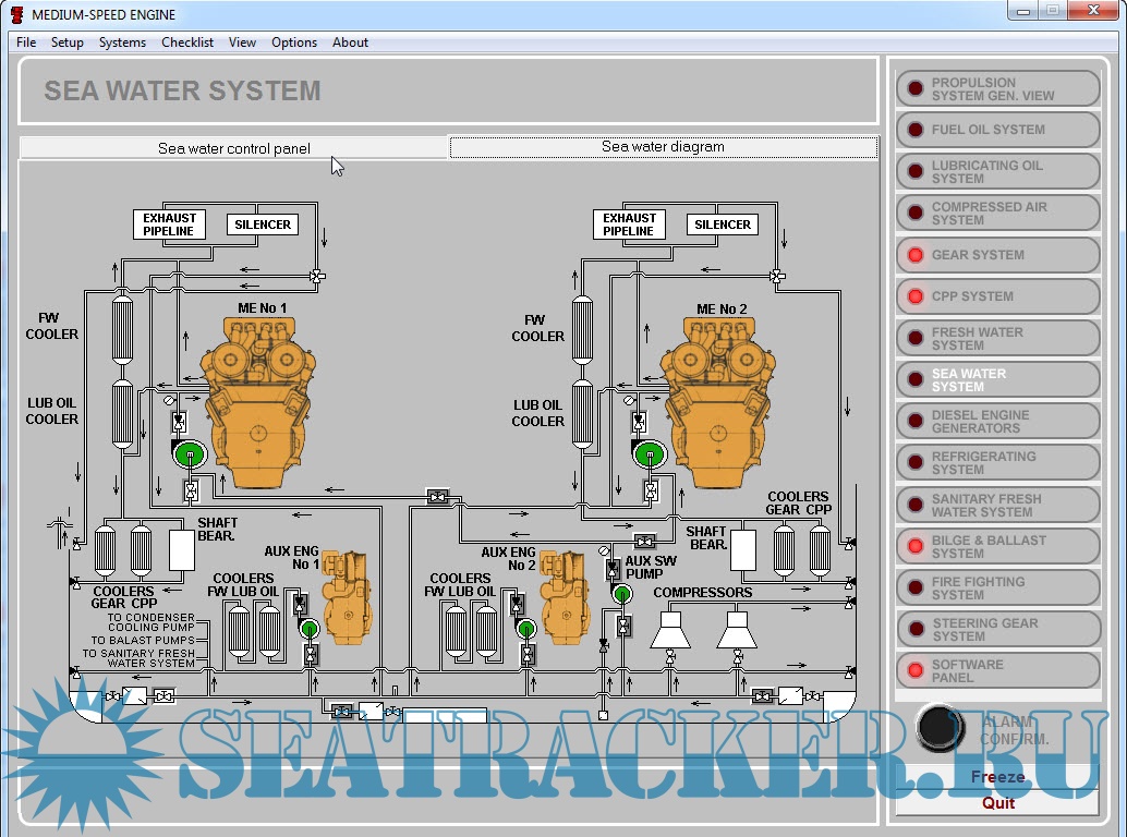The UNITEST MS Engine Room Simulator has been based on typical solutions, being presently used in medium-sized engine rooms (two four-stroke type main engines with reduction gear and CPP - controllable pitch propeller).