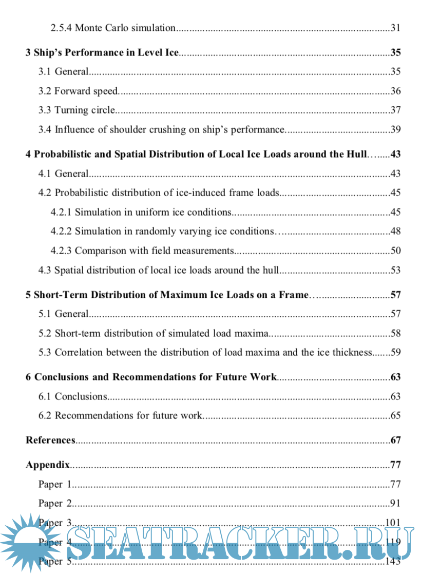 The present thesis focuses on a numerical model for simulating ice–hull interaction and ship maneuvers in level ice. This model is partly based on the empirical data, by which the observed phenomena of continuous icebreaking can be reproduced. In the simulation of a full-scale icebreaking run, the interdependence between the ice load and the ship’s motion is considered, and the three degree-of-freedom (DOF) rigid body equations of surge, sway and yaw are solved by numerical integration. The thickness and strength properties of the ice encountered by the ship are assumed to be constant or predefined based on the statistical data. Accordingly the global and local ice loads on ship hulls can be obtained in a deterministic or probabilistic way.