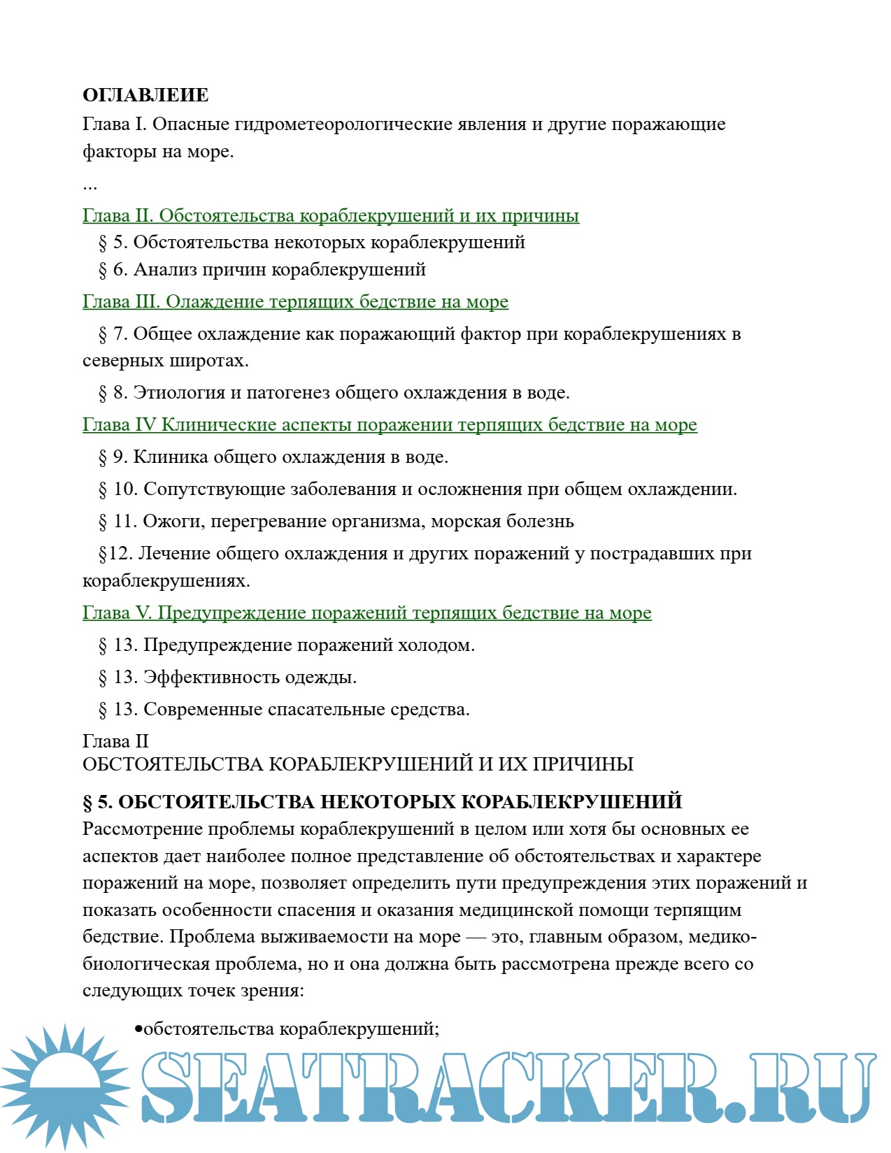 ОГЛАВЛЕИЕ Глава I. Опасные гидрометеорологические явления и другие поражающие факторы на море. ... Глава II. Обстоятельства кораблекрушений и их причины § 5. Обстоятельства некоторых кораблекрушений § 6. Анализ причин кораблекрушений Глава III. Олаждение терпящих бедствие на море § 7. Общее охлаждение как поражающий фактор при кораблекрушениях в северных широтах. § 8. Этиология и патогенез общего охлаждения в воде. Глава IV Клинические аспекты поражении терпящих бедствие на море § 9. Клиника общего охлаждения в воде. § 10. Сопутствующие заболевания и осложнения при общем охлаждении. § 11. Ожоги, перегревание организма, морская болезнь §12. Лечение общего охлаждения и других поражений у пострадавших при кораблекрушениях. Глава V. Предупреждение поражений терпящих бедствие на море § 13. Предупреждение поражений холодом. § 13. Эффективность одежды. § 13. Современные спасательные средства.