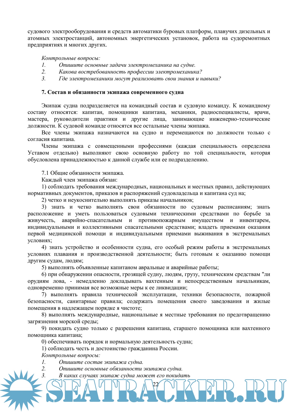 Description: Электромеханик на судне — это инженер, который ответственен за работу и исправность всего электрооборудования и автоматики судна. Такая сфера ответственности требует определенного немалого количества знаний, которые он получает за период обучения в университете и прохождении практики. Стандарты минимальной компетенции каждого члена экипажа судна представлены в международной конвенции о подготовке и дипломировании моряков и несении вахты.