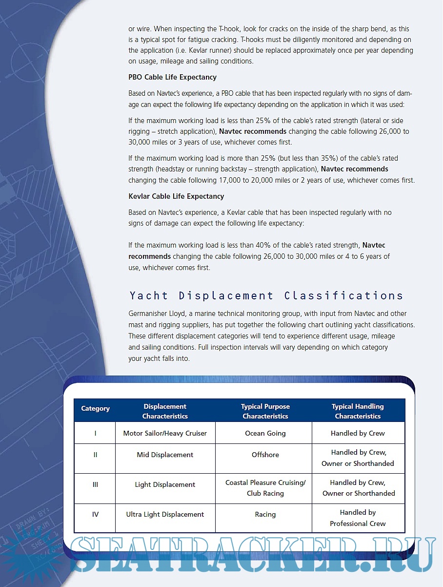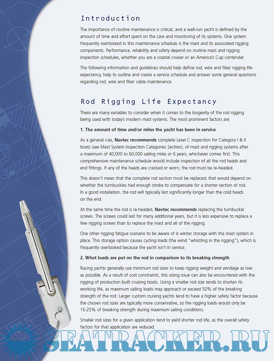 Description: This booklet is focused on the basic principles, surveying, maintenance, and life expectancy of both rod and wire rigging of yachts. The importance of routine maintenance is critical, and a well maintained yacht is defined by the amount of time and effort spent on the care and monitoring of its systems, mast and its associated rigging components in particular. For cruising and racing yachts performance, reliability and safety depend on routine mast and rigging inspection schedules. This guidelines should help define rod, wire and fiber rigging life expectancy, help to outline and create a service schedule and answer some general questions regarding rod, wire and fiber cable maintenance.