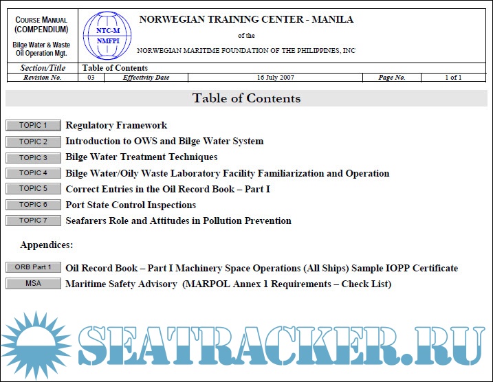 Additional info: Методические указания и теория обработки, хранения, сдачи нефтеводяных остатков (льяльных вод и шлама ) в условиях современных требований конвенкции МАРПОЛ. Норвежский Тренажёрный Центр - Манила, Филлипины, 2007г.