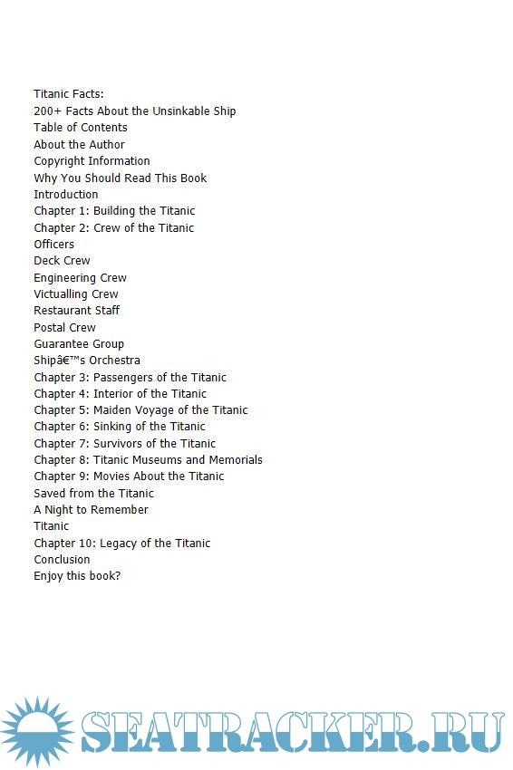 Description: Are you fascinated with the Titanic? Have you wondered what it must have been like to work in those hot boiler rooms, or as a maid to a First Class passenger? Have you wondered what it would have been like if you actually were a First Class passenger? Did you watch James Cameron’s Titanic and think, “How would I have survived the sinking?” Well, this book is for you. Inside, you will find over 200 facts about the Titanic. There are facts about: • Building the Titanic • Crew of the Titanic • Passengers of the Titanic • Interior of the Titanic • Maiden voyage of the Titanic • Sinking of the Titanic • Survivors of the Titanic • Museums of the Titanic • Movies about the Titanic • Titanic’s legacy Ready? Let’s go back to Titanic…