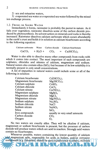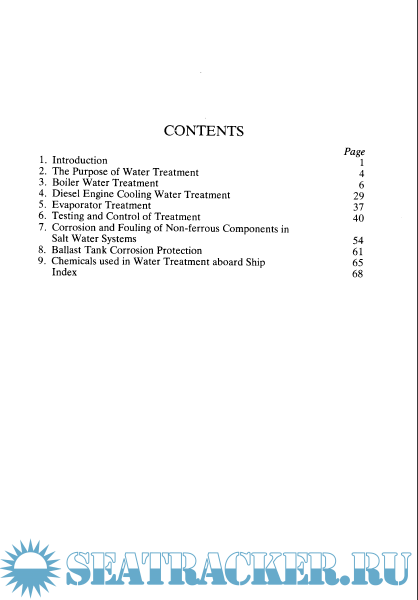 Year: 1990 Language: english Author: J. D. SKELLY, B.Sc., Chart. Chemist, M.R.I.C. Genre: Reference book Publisher: IMarEST ISBN: 0 900976 66 7 Format: PDF Quality: Scanned pages Pages count: 76 Description: The primary need for water treatment is simply that water, found in nature, contains impurities. These impurities cause problems when the water is used in evaporators, boilers, or as a cooling medium for diesel engines aboard ship. Water is, in fact, almost the "universal solvent" and this uniqueness of water can be traced back to its molecular structure. An intermolecular force comes into play amongst all molecules positioned closely together. This force is referred to as van der Wall's attraction. Positive charges in molecular nuclei attract electrons of other molecules, the force being great enough to overcome the mutual repulsion of surrounding electrons. The heavier the molecule the greater the intermolecular attraction. Thus, substances with high molecular weights, in general, have high boiling points. On this basis water with a molecular weight of 18 should boil at a considerably lower temperature than it does. The reason it does not is because of its amazing molecular structure.
