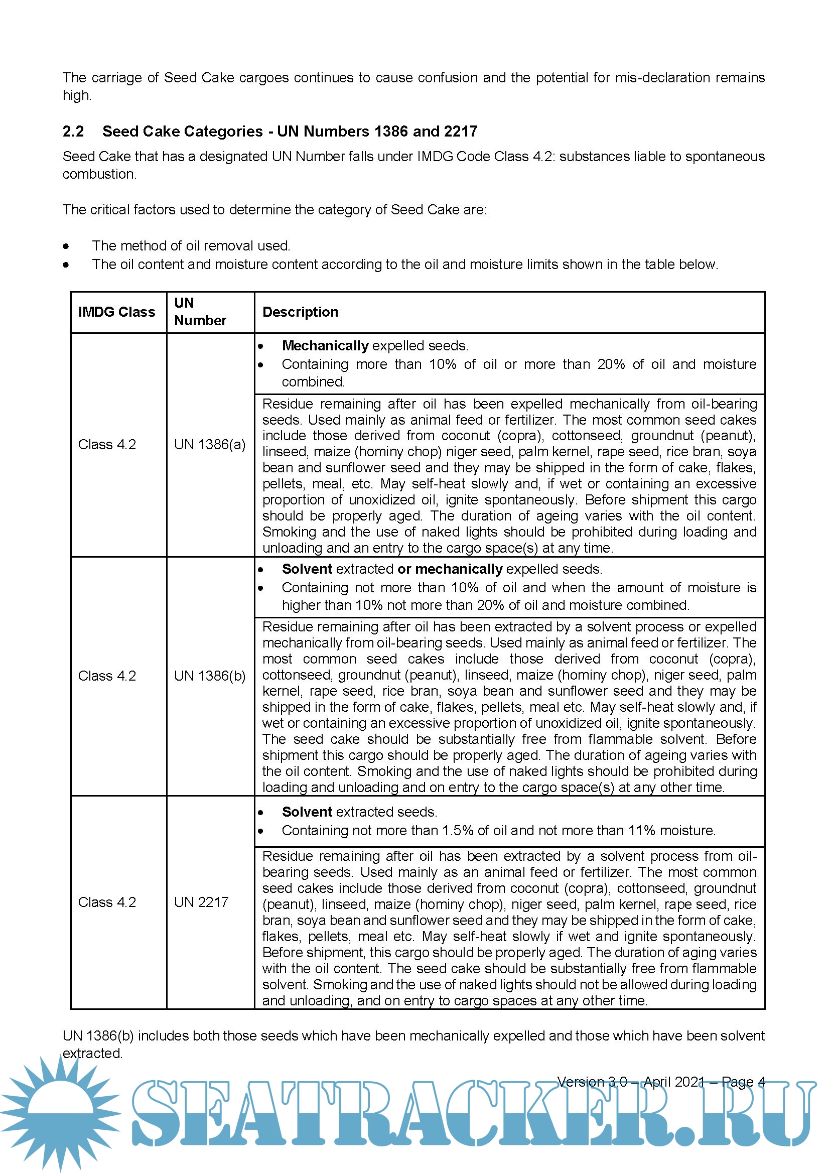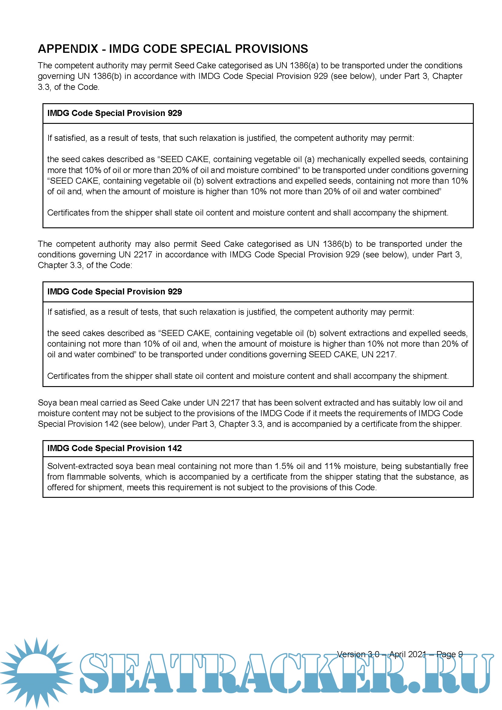 Description: This new version of the Guidelines notes that it is vital that Seed Cake that is not classified in Class 4.2 of the IMDG Code should be declared by the shipper to the receiving carrier and appropriate documentation provided to show that the Seed Cake as offered for shipment has been tested in accordance with the provisions of the IMDG Code.