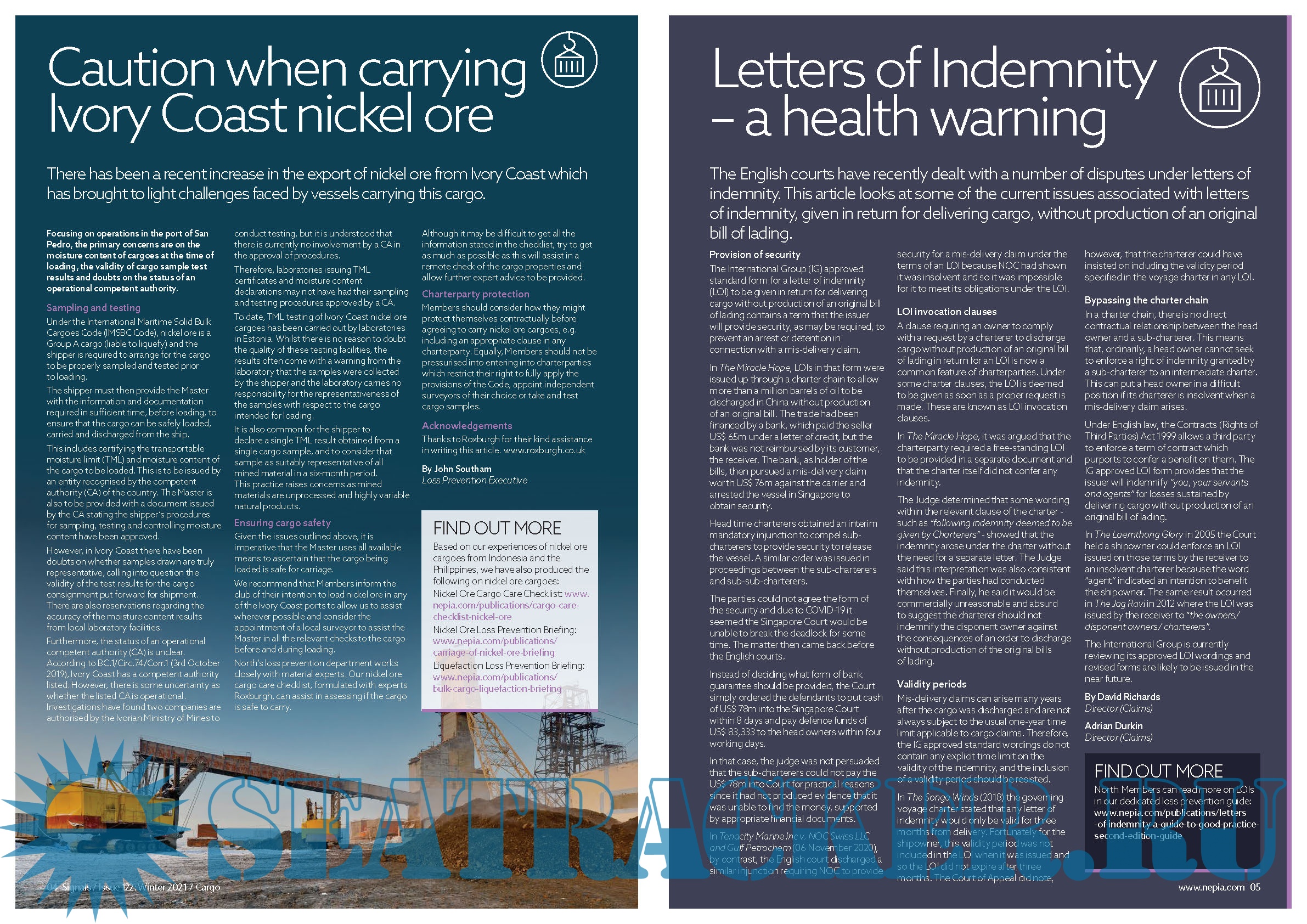 In this issues we look at what it means now the IMO have set out how they will regulate CO2 emissions from shipping. Elsewhere in this packed issue, we look at the risk of liquefaction from bulk cargoes, a timely and important health warning on letters of indemnity, handling angry stowaways, carrying out effective pollution drills and much, much more.