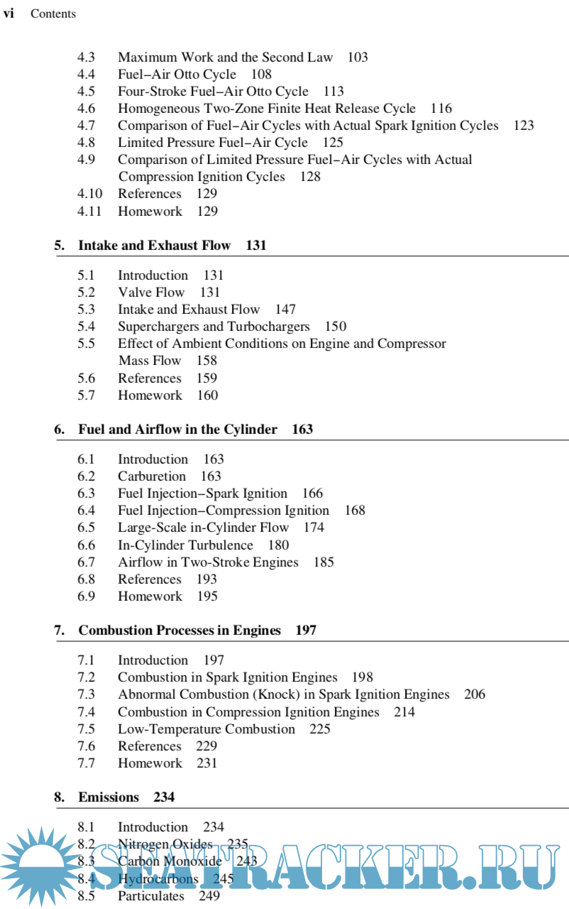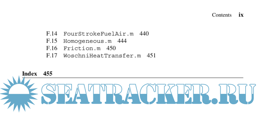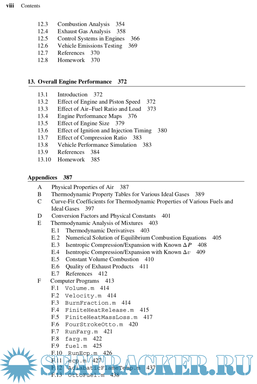 This third edition builds upon the foundation of the second edition. The major changes are the adoption of the programming software MATLABR for the examples, and chapter reorganization for a greater emphasis on combustion. The content changes include addi- tional topics on heat and mass loss in finite heat release models, thermodynamic properties of reacting mixtures, two-zone burn models for homogeneous mixtures, exhaust blowdown modeling, diesel fuel injection, NO