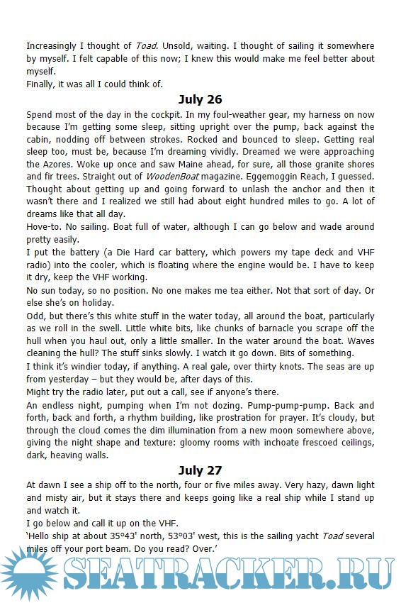Description: With only a sextant, his instincts as a seasoned sailor, and a boat filled with memories of his floundering marriage, Peter Nichols sets out on a solo voyage from England to Maine, where he plans to sell his beloved, twenty-seven-foot, engineless boat, Toad.Halfway across the ocean, his boat springs a leak and his voyage becomes a desperate struggle to survive.
