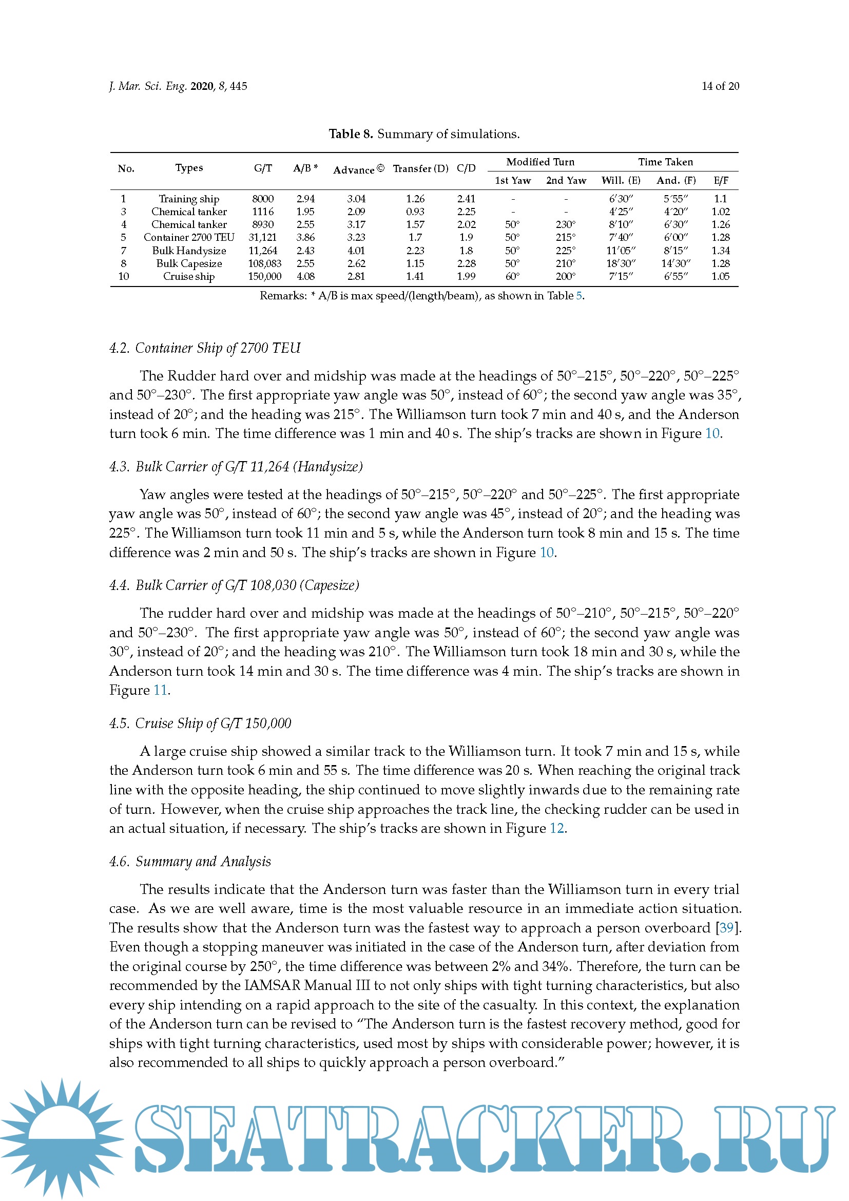 Although several studies have pointed out that the Williamson turn needs to be applied in a modified form for proper application, in terms of returning ability to the original track line, it has not yet been modified in the Manual. Therefore, the purpose of this study is to analyze the serviceability of the four standard recovery maneuvers through a series of ship-handling simulations with representative types of ships.