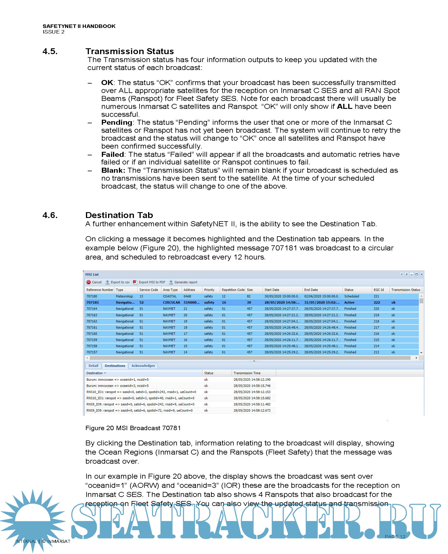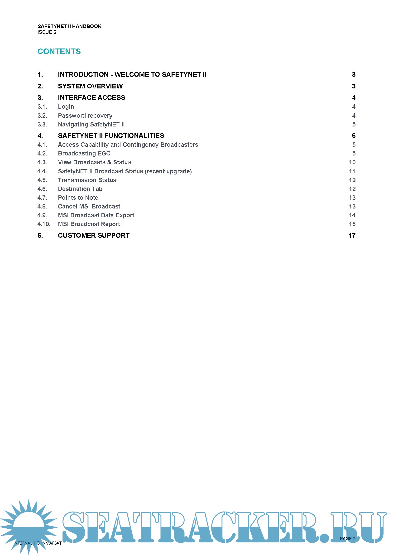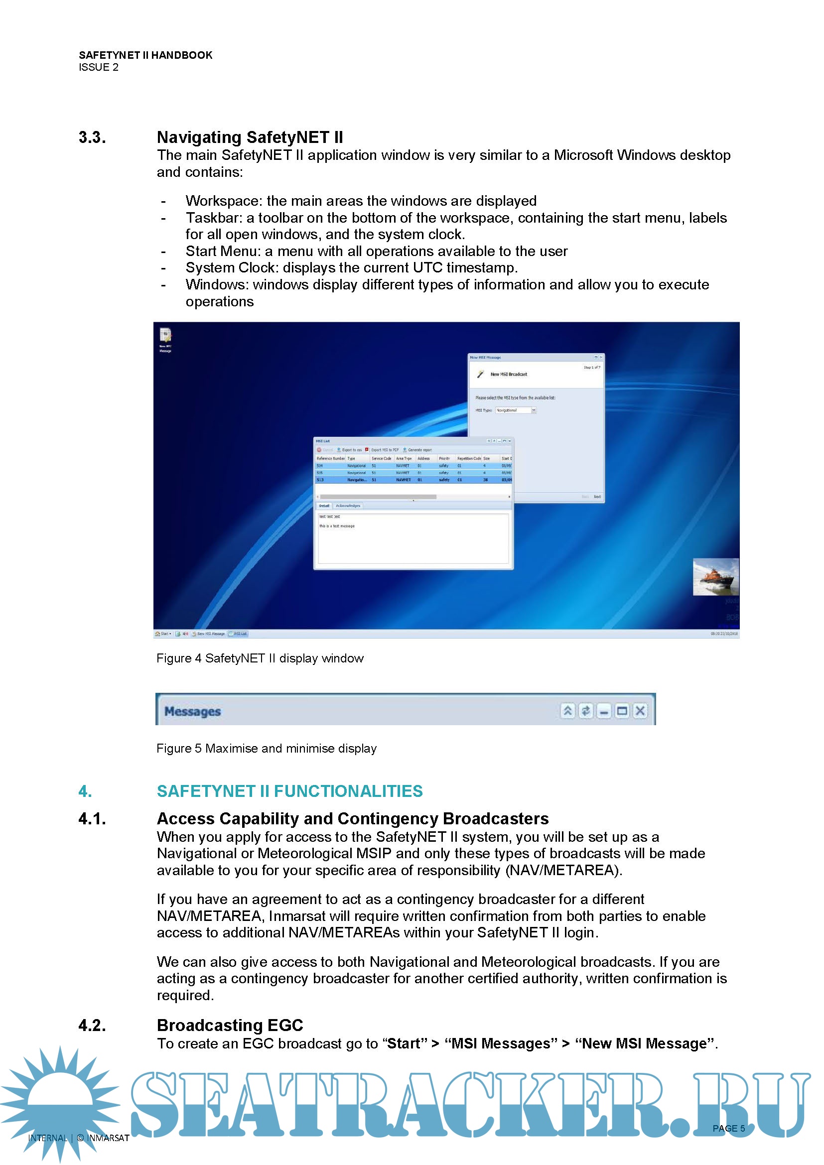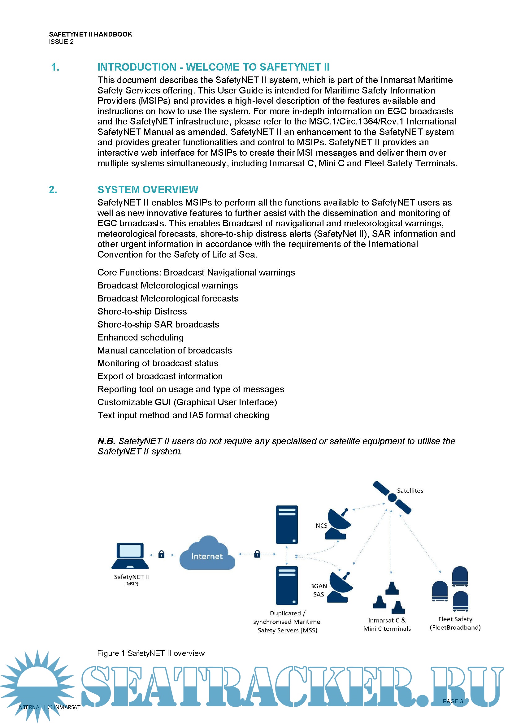 Description: This document describes the SafetyNET II system, which is part of the Inmarsat Maritime Safety Services offering. This User Guide is intended for Maritime Safety Information Providers (MSIPs) and provides a high-level description of the features available and instructions on how to use the system. For more in-depth information on EGC broadcasts and the SafetyNET infrastructure, please refer to the MSC.1/Circ.1364/Rev.1 International SafetyNET Manual as amended. SafetyNET II an enhancement to the SafetyNET system and provides greater functionalities and control to MSIPs. SafetyNET II provides an interactive web interface for MSIPs to create their MSI messages and deliver them over multiple systems simultaneously, including Inmarsat C, Mini C and Fleet Safety Terminals.