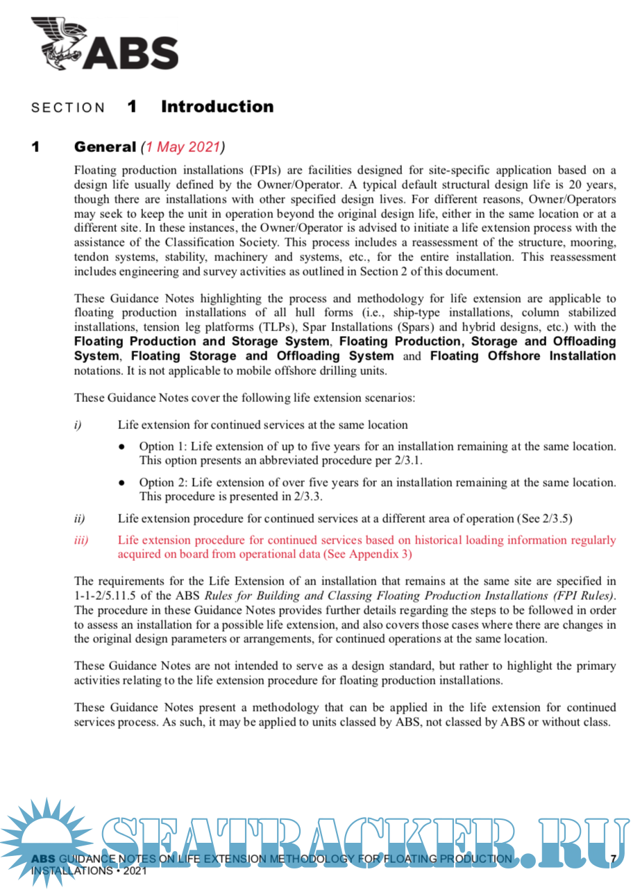 Description: The Guidance Notes on Life Extension Methodology for Floating Production Installations have been developed to provide guidance for assessment of existing floating production installations when the intended period of operation at the original site or the cumulated operating time at both the original and relocated sites is extended beyond the original design life period. These Guidance Notes supplement the requirements for life extension and relocation of floating production installations in accordance with the ABS Rules for Building and Classing Floating Production Installations (FPI Rules).