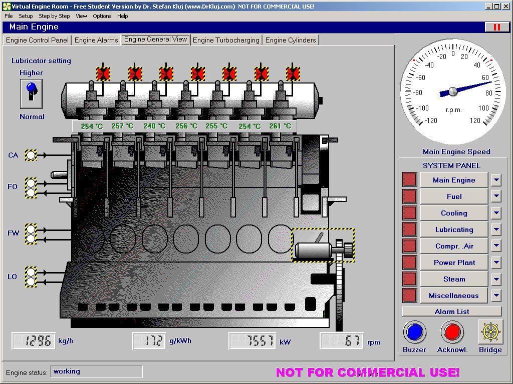 Virtual Engine Room Student - Бесплатная версия, которая включает в себя подробную пошаговую инструкцию, которая поможет пользователю при работе с программой. Выполнение команды может быть остановлено в любое время, но полученные результаты (по состоянию машинного отделения) не могут быть сохранены для будущего продолжения.