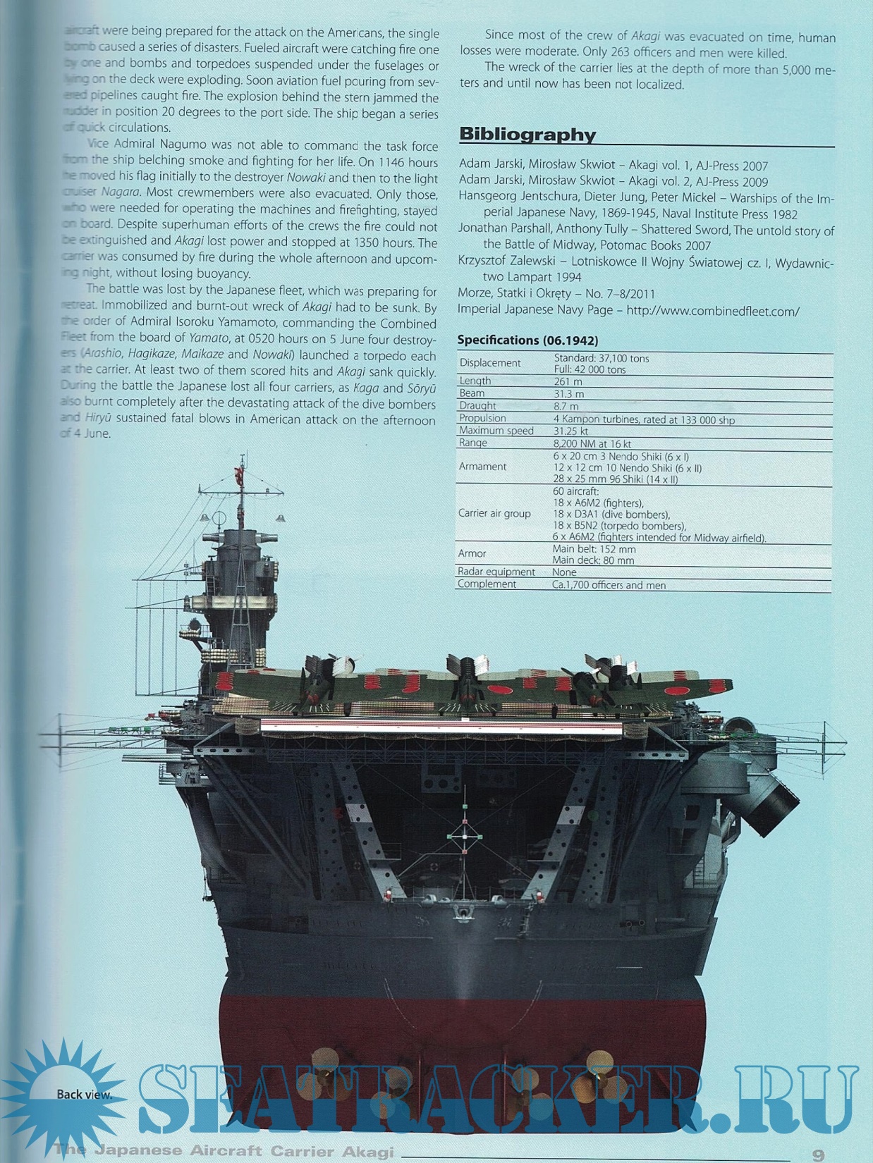 Description: The vessel, which was to become the most famous Japanese aircraft carrier and the symbol of the might of the Imperial Japanese Navy aviation was initially built as a battlecruiser. Only as the result of the resolutions of the Washington Naval Treaty the Akagi (“Red Castle”, the name of a Japanese mountain) was completed as an aircraft carrier. During the first half-year of the war in the Pacific she was the flagship of the carrier strike group marching from one victory to another. The reversal took place during the battle of Midway, when a hit by a single bomb in a fatal moment sealed her fate.