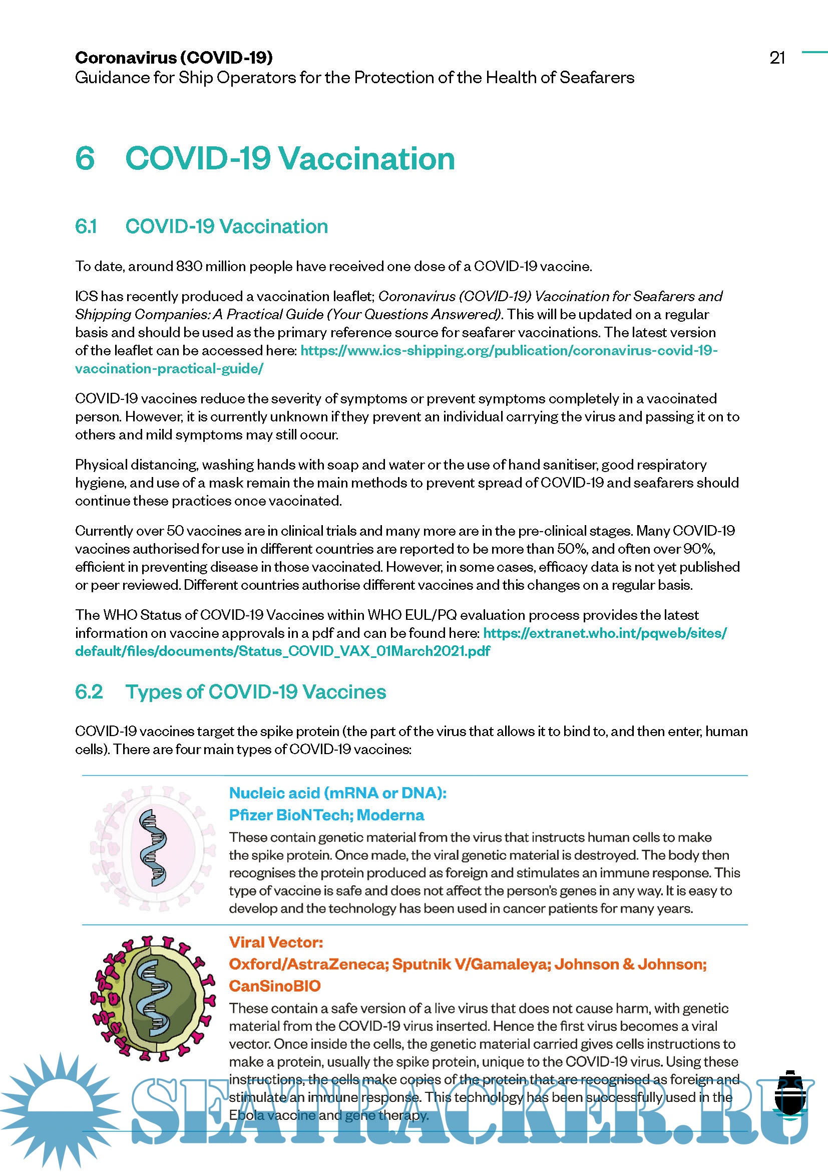 Year: 2021 Language: english Author: ICS Genre: Guide Format: PDF Quality: eBook Pages count: 56 Description: This Guidance has been produced by International Chamber of Shipping (ICS) to help shipping companies and seafarers follow health advice provided by United Nations agencies and others in response to the coronavirus (COVID-19) disease, which has been declared a pandemic by the World Health Organization (WHO), under the WHO International Health Regulations (IHR). The Guidance is for use on all types of ship and tries to take into account the needs of both cargo and passenger ships. It is recognised that cargo ships are unlikely to have a fully trained doctor or nurse on board and that medical treatment on cargo ships will be provided by a crew member with training to Standards of Training, Certification and Watchkeeping for Seafarers (STCW) medical requirements. New in the Fourth Edition: - An updated introduction reflecting the current situation of the COVID-19 pandemic; - A new section on myth busting advice during the COVID-19 pandemic; - A new section on COVID-19 vaccines; - Updated downloadable posters, including three new posters featuring safety guidance for ashore and on board and mental health support for seafarers; and - Two updated annexes with guidance on the use of masks and decision making for possible or confirmed COVID-19 cases on board. Version 4.0 – 7 June 2021