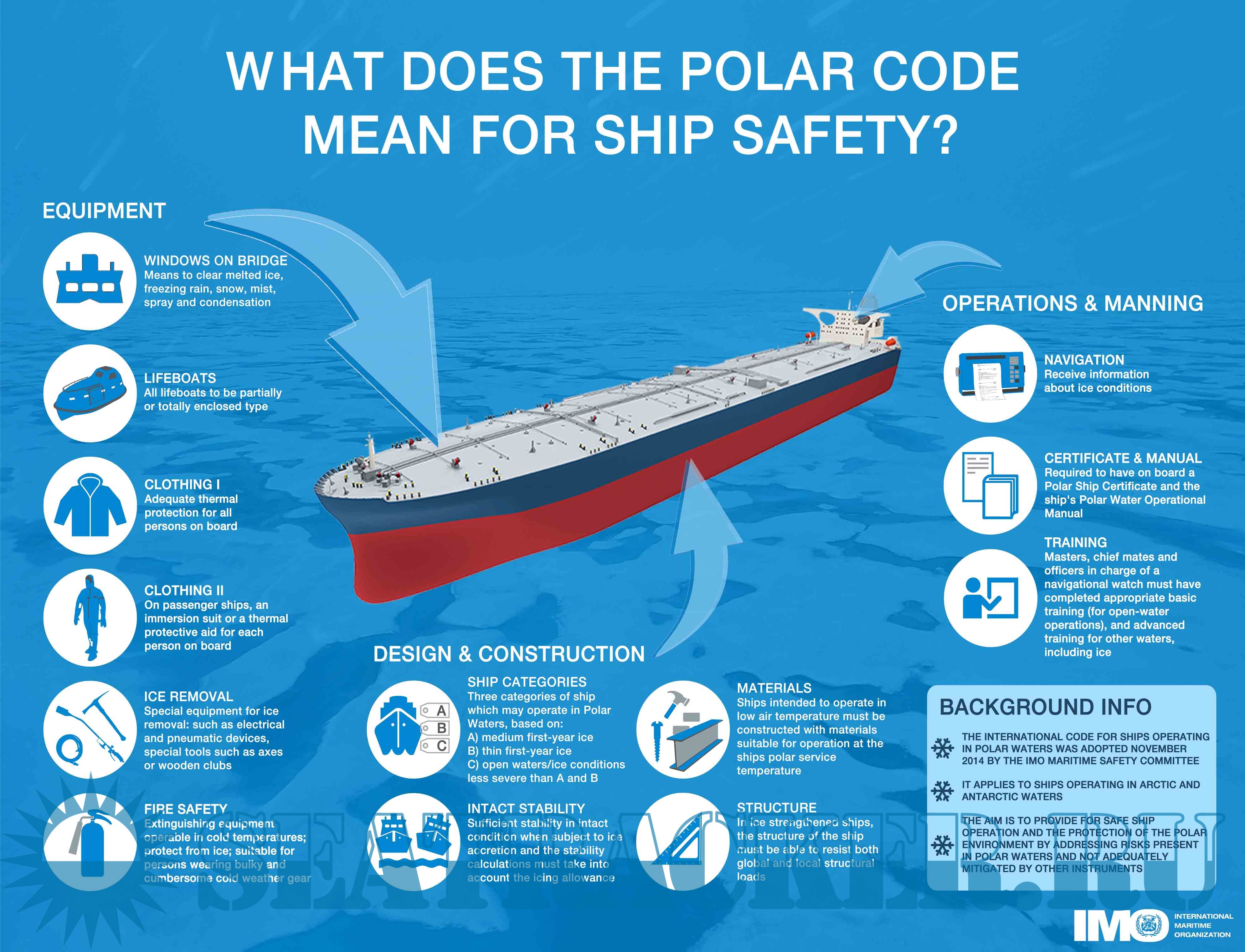 Description: The Polar Code has been developed to supplement existing IMO instruments in order to provide a more comprehensive set of provisions to address the increased interests and traffic in the polar regions, and the unique operational, environmental and search and rescue concerns peculiar to these areas, taking into account that the consequences of any major safety or pollution incident in polar waters are likely to cause widespread harm to these pristine environments.