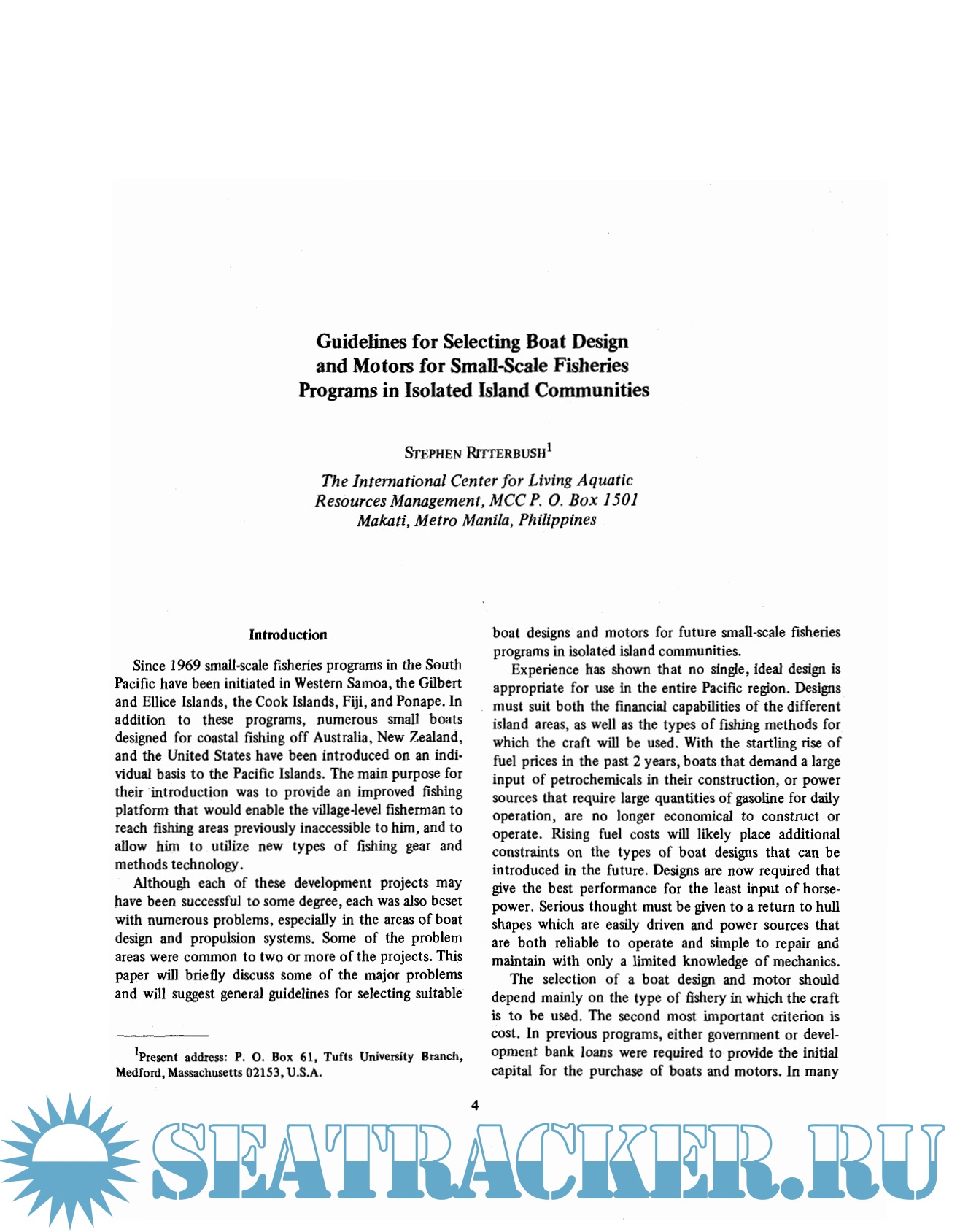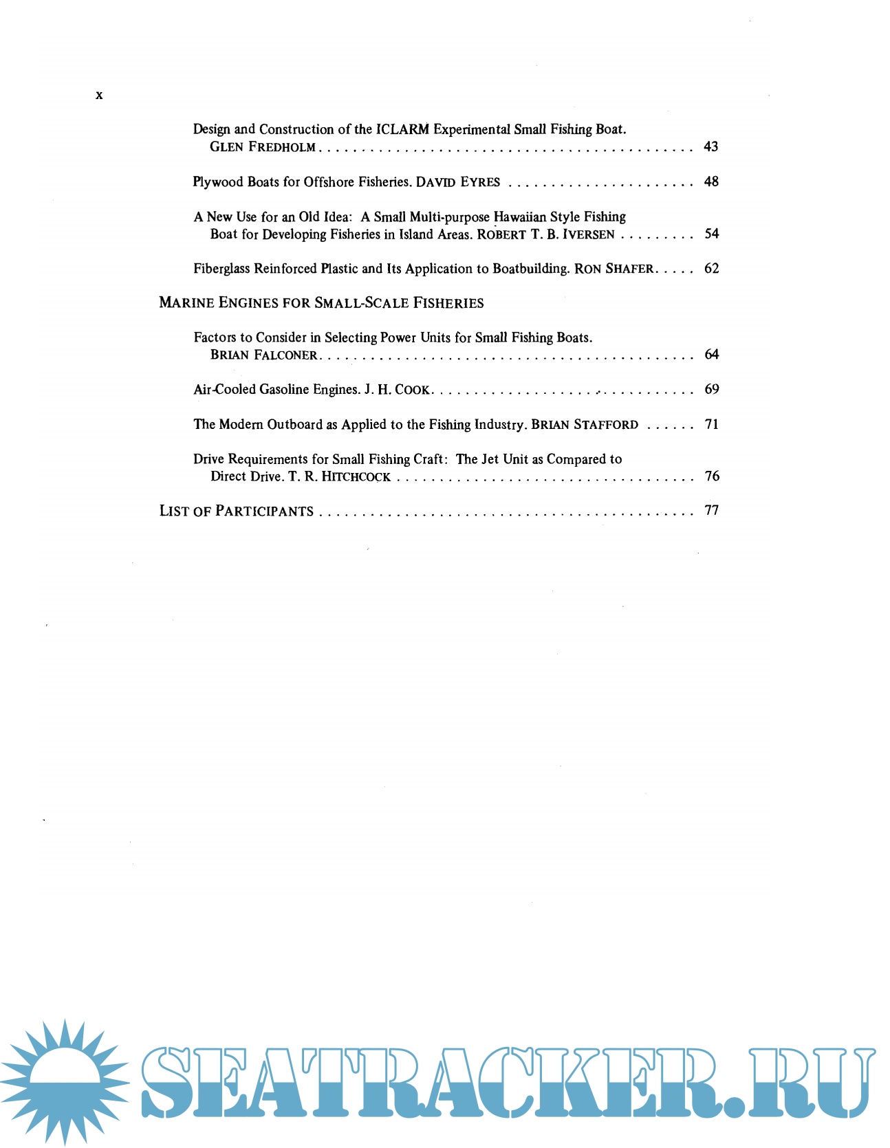 Description: Sixteen papers are presented on existing and proposed designs for hulls and engines of Pacific Island small-scale fishing craft. No single design is adaptable for use throughout the Pacific. The selection of designs and engines should be based on least input of petroleum products. Consideration should be given to standardizing engine models to simplify repairs. A consultative design group is proposed to test combinations of hulls and propulsion systems.