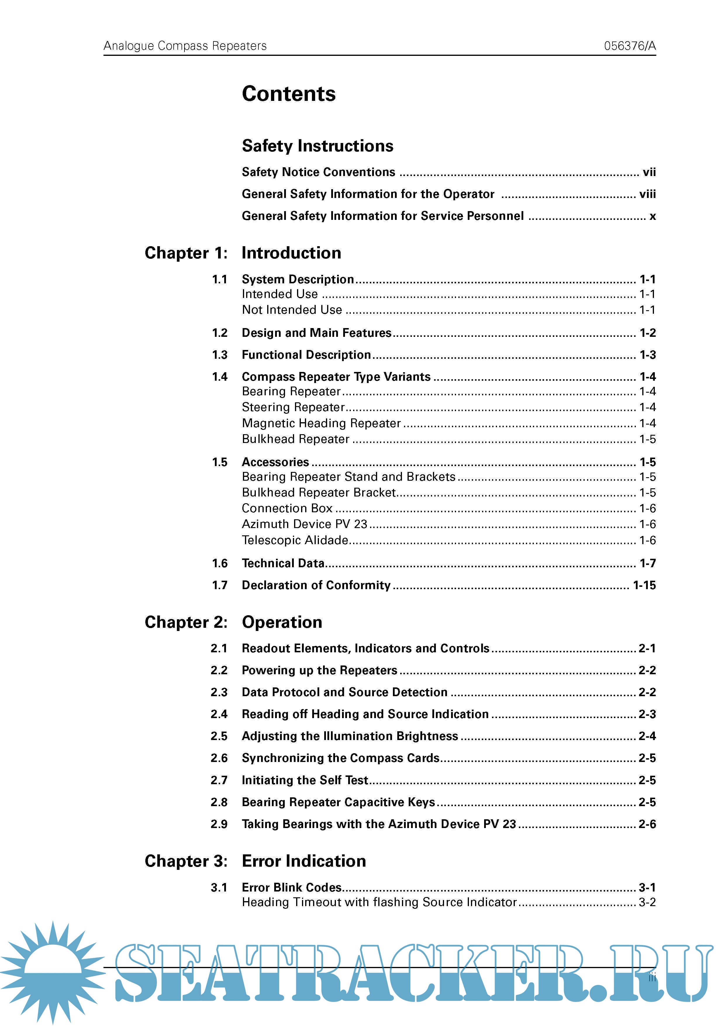 The analogue compass repeaters are not allowed to be used for the navigation of inland water vessels and river boats. Any exception to this restriction must be regulated by specific certification of an entitled organisation or administration, for further details see certification information under ‘Design and Main Features” on page 1-2 and ‘Declaration of Conformity” on page 1-15.