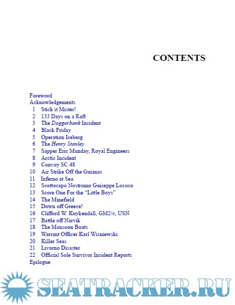 Description: e incredible stories of twenty-two lone survivors of maritime disasters are presented in this collection of war and peacetime incidents. The dramatic accounts--including those of a British sailor who survived 133 days at sea on an open raft and a German sailor who spent 28 hours in the ocean without a life preserver--are based on a wide array of sources, including interviews with the survivors and their families and official records to back up their accuracy. Most took place in World War II, when the navies and merchant fleets of many nations roamed the seas. Each story is one of boundless courage, a tenacious will to survive, and, in many cases, good luck.