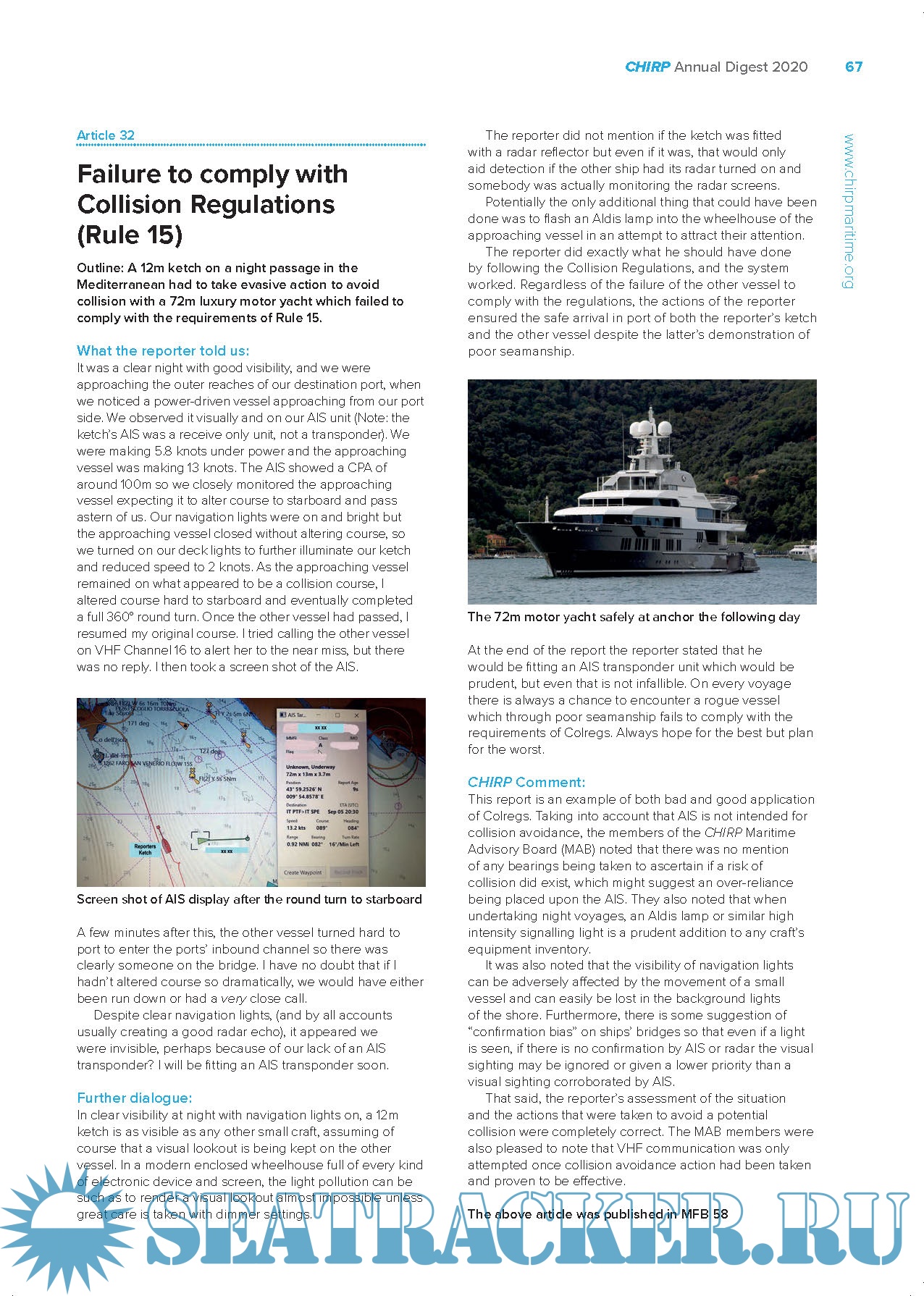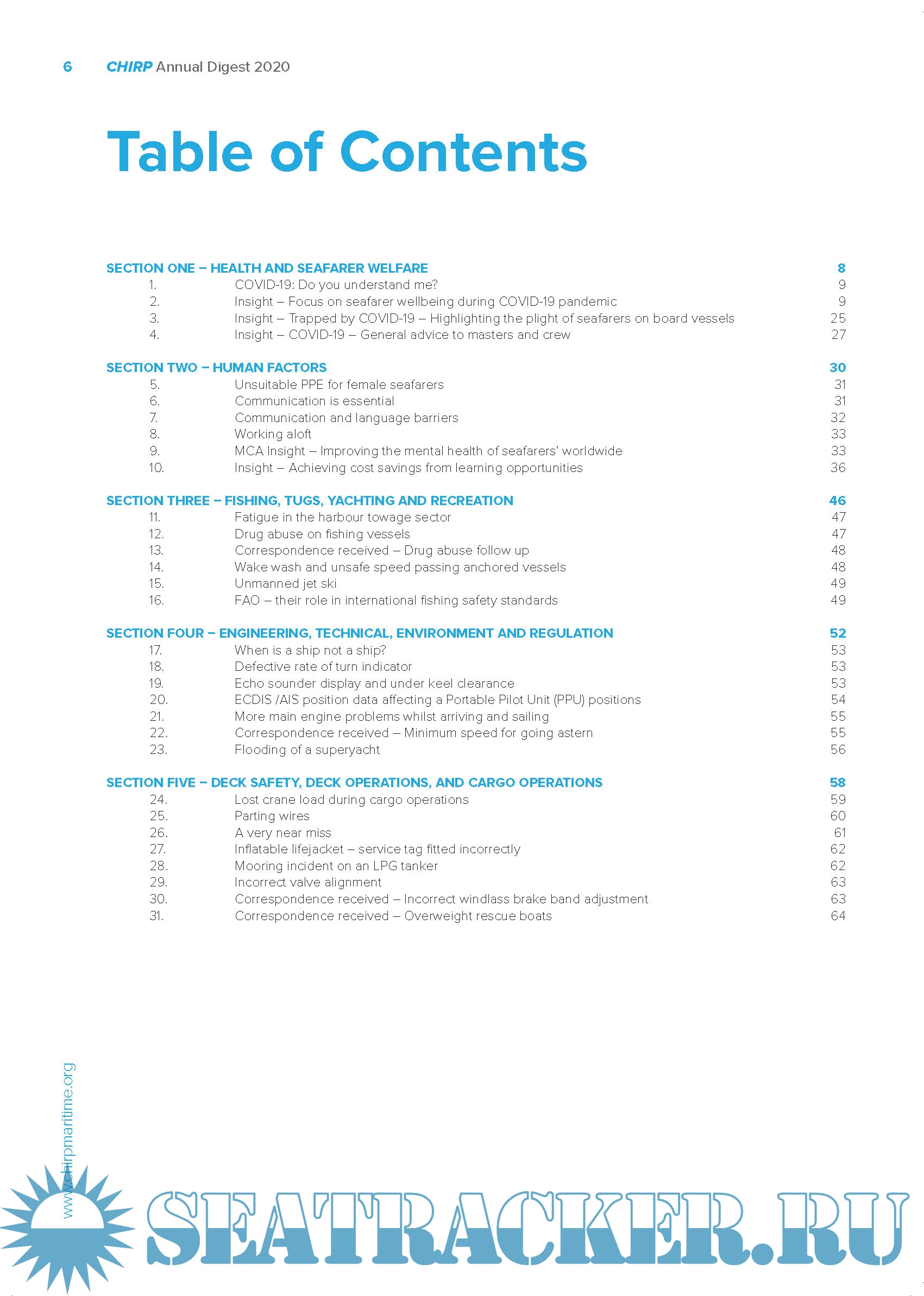 Year: 2021 Language: english Author: CHIRP Maritime Format: PDF Quality: eBook Pages count: 106 Description: This publication contains summaries of all cases published by CHIRP (Confidential Human Factors Incident Reporting Programme) during 2020. CHIRP Maritime aims to improve maritime safety by providing an independent and confidential reporting system for all individuals employed in or associated with the industry, analysing data and identifying safety trends and informing the community of safety related reports and trends. The Digest categorises incidents according to human factors, deck safety, engineering, technological, environmental, pilotage, COLREGs/navigation, safety culture and health and etc.