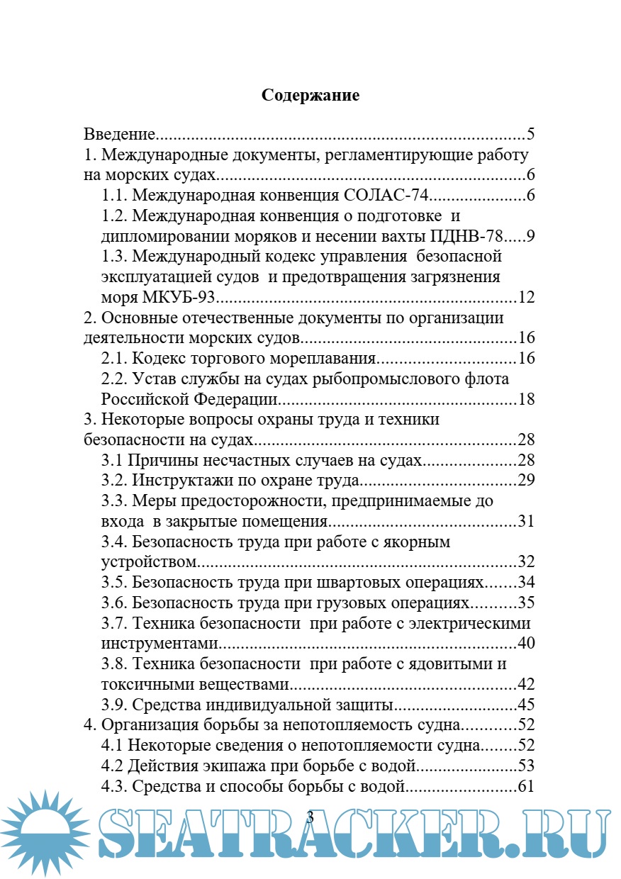 Год выпуска: 2013 Язык: русский Автор: Белаш А.П. Жанр: Учебное пособие Издательство: КамчатГТУ Формат: PDF/DOC Качество: Изначально компьютерное (eBook) Количество страниц: 110 Описание: Пособие составлено в соответствии с требованиями к обязательному минимуму содержания основных образовательных программ морских специальностей государственных образовательных стандартов высшего профессионального образования и требованиями Международной Конвенции ПДМНВ-78/95. Международные документы, регламентирующие работу на морских судах Основные отечественные документы по организации деятельности морских судов Некоторые вопросы охраны труда и техники безопасности на судах Организация борьбы за непотопляемость судна Способы личного выживания
