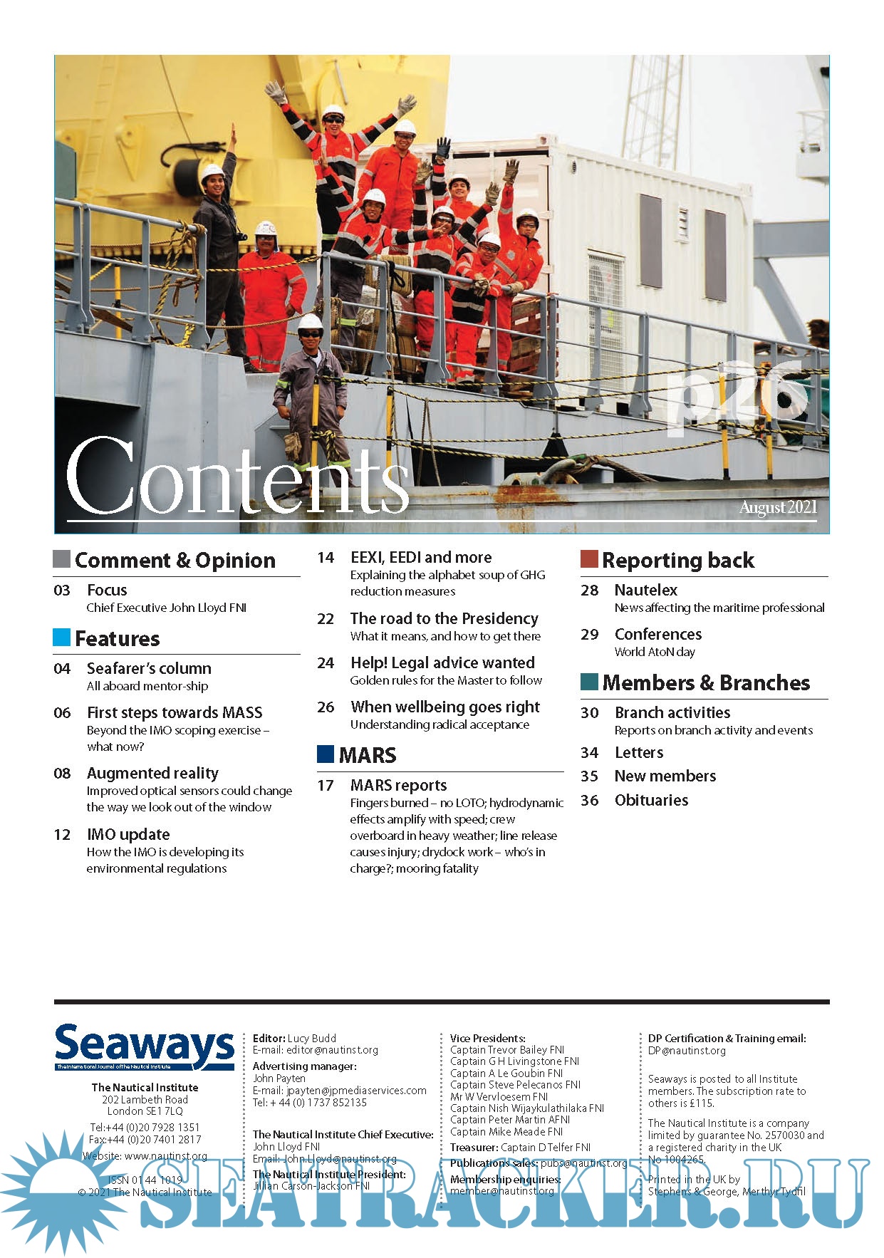 The vitality of the journal is shared by those who contribute to it and those who read it. It is designed to advance high professional standards and promote fellowship within the profession. This is achieved through contributions and debate directed at a practical level, designed to improve the safe and efficient operation of ships and other maritime ventures.Seaways is the vehicle which links professionals worldwide and enables members to be kept up-to-date with changes in legislation, management and technical procedures, new ideas and books, and announcements. It is also a steadying influence on impractical proposals.