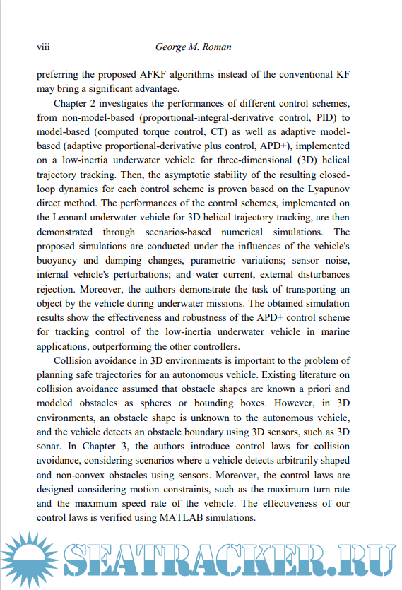 Description: Underwater Vehicles: Design and Applications first explores the application of the adaptive Kalman filter algorithm to the estimation of high speed autonomous underwater vehicle dynamics.