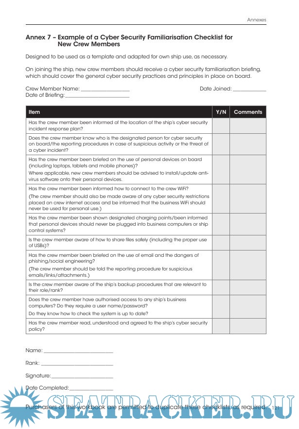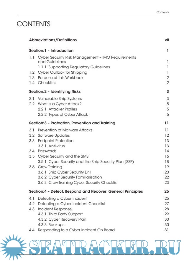 Year: 2021 Language: english Author: Witherbys, BIMCO & ICS Publisher: Witherby Publishing Group Ltd. Edition: 2nd ISBN: 978-1-85609-946-2 Format: JPEG Quality: Photo of pages Pages count: 121 Description: This is a practical and easy to understand guide to support the Master and the ship’s crew with cyber security risk management. It provides detailed guidance on all aspects of cyber security protection, defence and response (including new sections on remote access, intrusion detection systems and engine department considerations). It also includes comprehensive checklists to assist with the practical, day-to-day management of onboard cyber security. 'Cyber Security Workbook for On Board Ship Use' is referenced in ISGOTT Sixth Edition as a source of practical guidance for Masters and ship’s crew (ref: ISGOTT 6, section 6.4, para.3). Additional info: Blank pages have been delibrately omitted. These are screenshots from Witherby Reader Software compiled together as searchable PDF, hence zooming will distort clarity! Please consider buying a legal copy for crystal clear text !