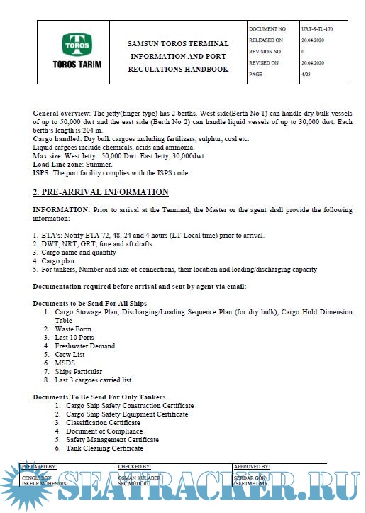 Information and Port Regulations Handbook for Toros Terminal, Samsun, Turkey