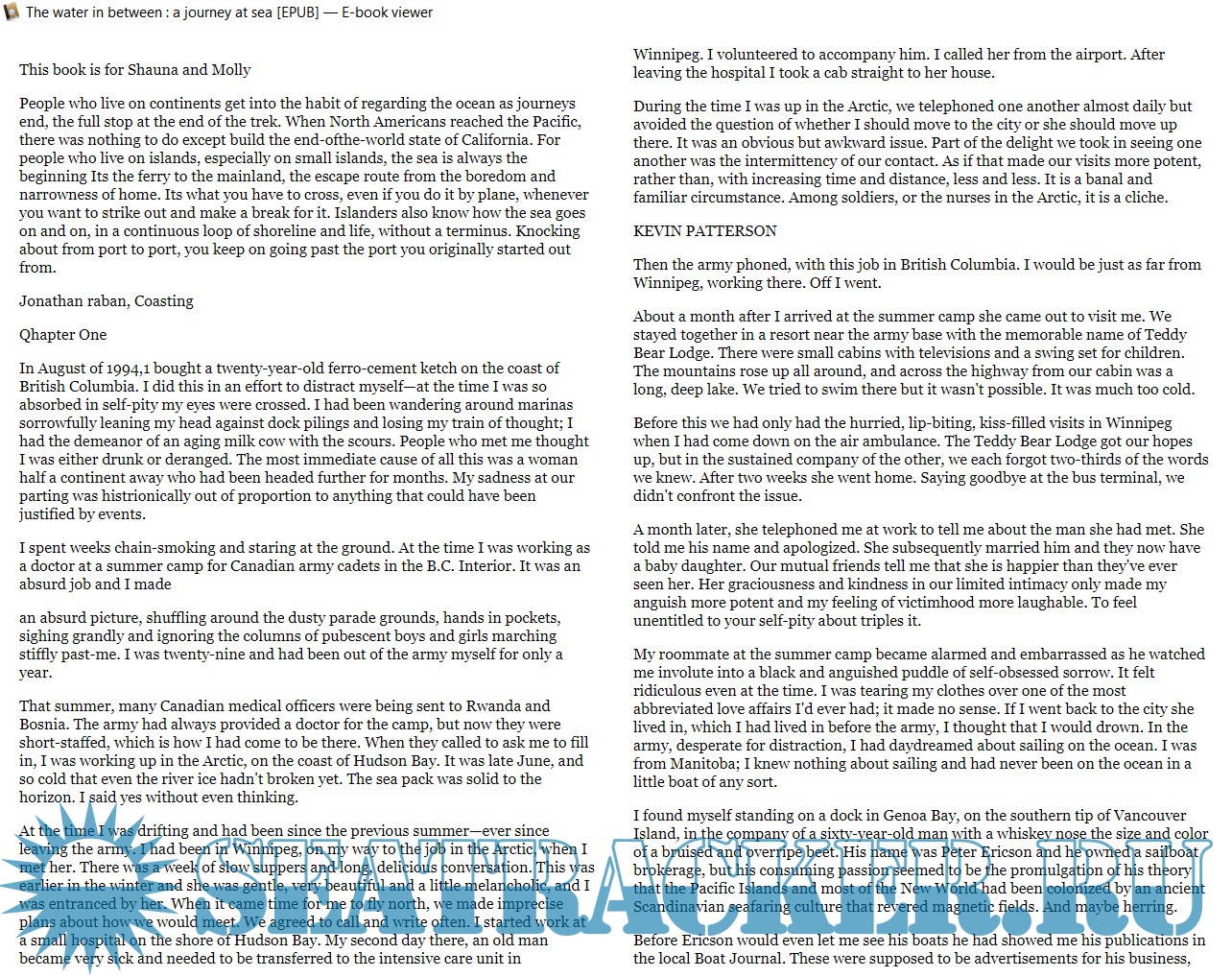 The Water In Between recounts their voyage. At times wryly funny, Patterson's tale is more often tinged with melancholy. The sailors meet other travelers, visit remote locales, and survive both storm and calm. Through it all, the shadowy presence of Bruce Chatwin remains at Patterson's side--and sometimes hangs around his neck like an albatross. Perhaps solitude was not the solution? As a storm raged around him, Patterson "sat there on my bouncing boat with an intimation of disquiet--if even Chatwin couldn't realize his ideal, what was I doing here, emulating him?"