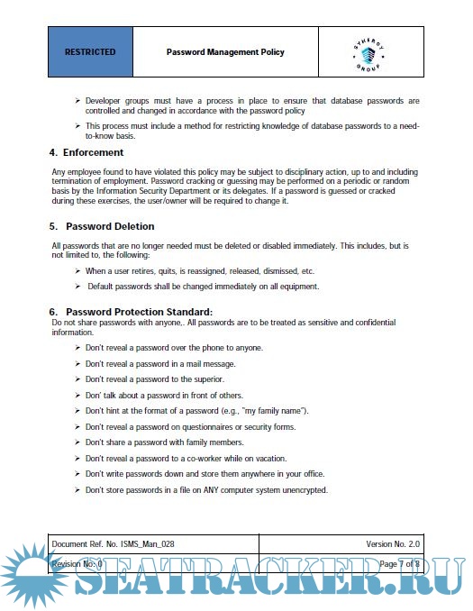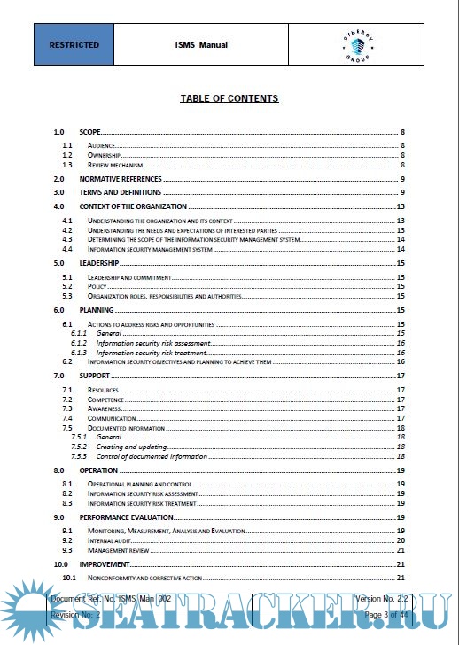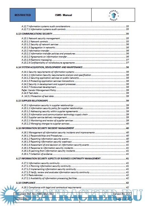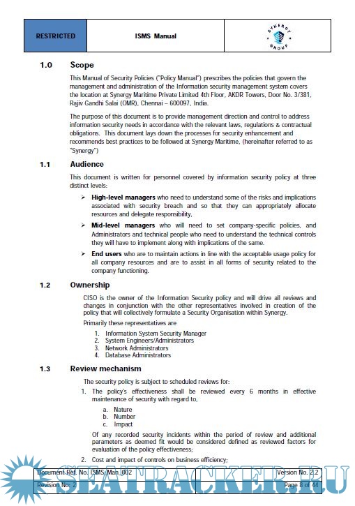 Year: 2020 Language: english Author: Synergy Maritime Pvt. Ltd. Genre: Manual Publisher: Synergy Maritime Pvt. Ltd. Edition: 2 Format: PDF Quality: eBook Pages count: 402 Description: The purpose of this document is to provide management direction and control to address information security needs in accordance with the relevant laws, regulations & contractual obligations. This document lays down the processes for security enhancement and recommends best practices to be followed.