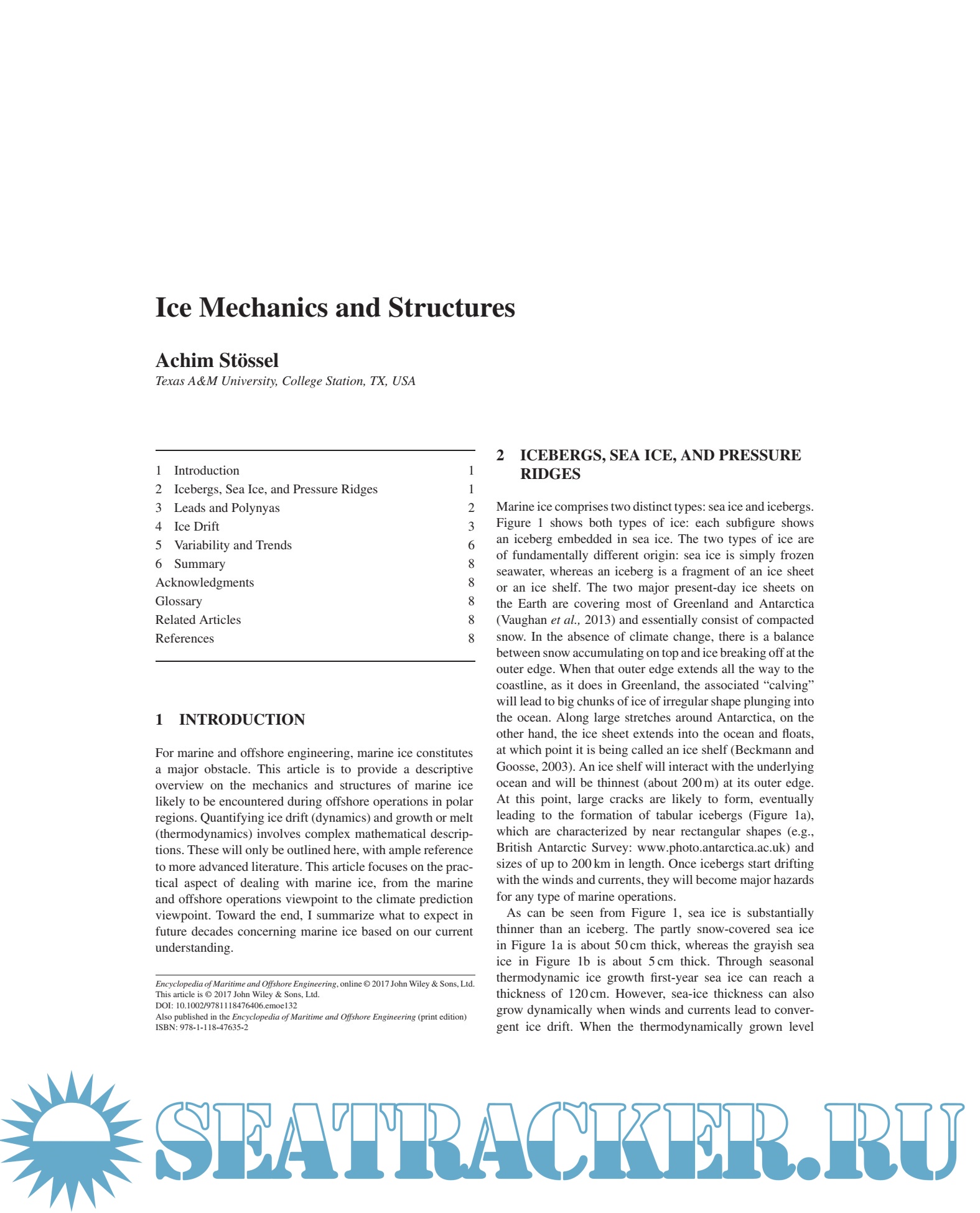 Volume 1 General Historical Development of the Marine Industry Historical Development of the Offshore Industry MetOcean Parameters and Processes Tides and Water Levels Wind, Wave and Current Modeling and Prediction Volume 2 Marine Ship Types, Duties, General Characteristics Resistance, Propulsion and Propulsors Propulsor Types Ship Performance Prediction Propulsion Model Testing Numerical and Hybrid Prediction Methods for Ship Resistance and Propulsion Statistical and Theoretical Prediction Methods Volume 3 Editorial Board Ship Vibration, Noise and Habitability Regulatory and Classification Limits Ship Noise Control Ship Vibration, Global, and Local Modes Machinery Noise and Vibration Sources Propeller- and Thruster-Induced Noise and Vibration Calculation Methods for Vibration and Structure-Borne Noise Structure-Borne Noise Transmission in Ships Underwater Noise Radiation, Mechanisms, and Control Underwater Noise from Large Commercial Ships—International Collaboration for Noise Reduction Volume 4 Offshore Offshore Technology Hydrodynamic Scale Model Tests for Offshore Structures Classification and Certification Safety Management of Offshore Installations Underwater Technology Platforms A Brief Review of Structural Health Monitoring with Special Focus on Damage Detection and Sensor Optimization Subsea Technology Practical Challenges that Flow Assurance Engineers Face During Engineering Design and Field Operations Corrosion Subsea Production Control Systems Subsea Trees Volume 5 Integrity Management Structural Integrity Management (SIM): Offshore Structures Reassessment of Fixed Offshore Structures Fatigue Life Extension Ultimate Strength Analysis Reserve Strength and Redundancy Hydrodynamics of Substructure and Wave-in-Deck Loading on Fixed Steel Platforms Remediation and Repair of Offshore Structures Inspection Strategies Risk Reduction Strategies Volume 6 Ocean Renewable Energy Introduction to Offshore Renewables Offshore Wind Energy Technology Wave Energy Tidal Energy Ocean Thermal Energy Conversion Green Ship of the Future Offshore Geotechnics Integrated Geophysical and Geotechnical Planning: Through Use of Integrated Geoscience Techniques Geohazard Risk Assessment and Seismicity Submarine Landslides—Stability Analysis and Risk Assessment for Offshore Developments Seabed Gas Hydrates The Generation of Tsunamis Seabed Processes: Sediment Transport, Scour, and Sedimentation Geophysical Techniques for Offshore Site Investigation Geotechnical Investigation and In Situ Testing Laboratory Testing
