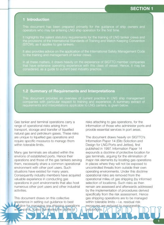 Year: 2003 Language: english Author: SIGTTO Publisher: Witherbys Publishing Edition: 1st Format: PDF Quality: Scanned pages Pages count: 37 Description: This book provides guidance for shipowners and operators who are new to LNG ship operation. It highlights the relevant statutory requirements for training LNG tanker crews, the STCW that are applicable to gas tankers, and the application of the ISM Code (for training and management of tanker crews). This book draws on the experience of SIGTTO member companies who have extensive operating expertise in this area. The book outlines current practice in LNG ship management companies, particularly in relation to training and experience, and looks at the operational risks involved in gas tanker and terminal operations that arise from transport, storage and transfer of liquefied natural gas and petroleum gas. The risks involved are unique to this industry and as a result require specific measures to manage them within tolerable limits. Gas terminals are often sited within established ports, meaning that the operations of the port and gas terminals serving them have a common operational environment. This means that the industry members have gained invaluable experience in carrying out gas operations in a port environment. This book highlights the risks involved when managing gas shipping operations, which is useful information for those administering ports and providing essential services within port areas. Operators require both a systematic assessment of operating risk and a range of risk reduction measures that can be tailored to specific situations. The guidance and information provided in this book aims to satisfy these needs.