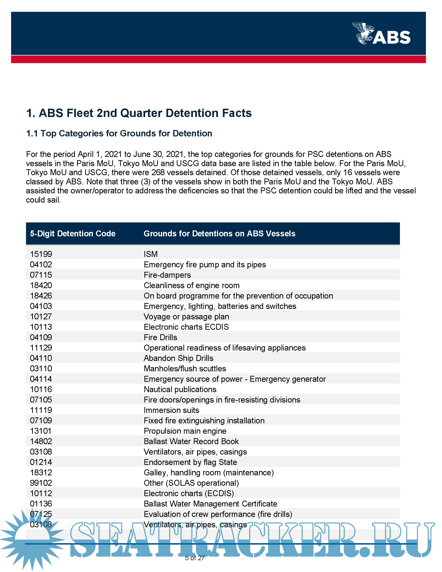 Year: 2021 Language: english Author: ABS Genre: Research papers Format: PDF Quality: eBook Pages count: 27 Description: This ABS Quarterly Report on Port State Control (PSC) provides information to owners on deficiencies identified on ABS vessels during inspections carried out by the various PSC regimes globally during the 2nd Quarter of 2021. This report is being made available to assist owners by providing awareness of potential areas of concern that have been identified on ABS classed vessels.