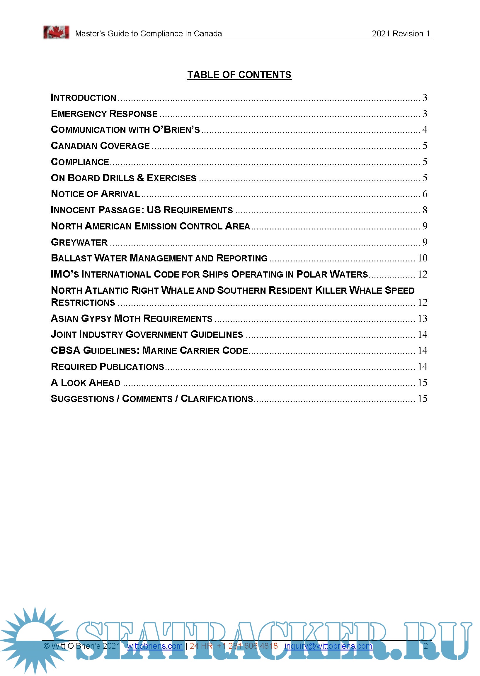 The Master of any vessel making a call to Canada faces several regulatory issues that are specific to Canada. This guide is intended to help the Master effectively and efficiently face these issues. Witt O’Brien’s is providing this guide to help ensure your compliance. Use of the directions in the guide will allow Witt O’Brien’s to better serve you.
