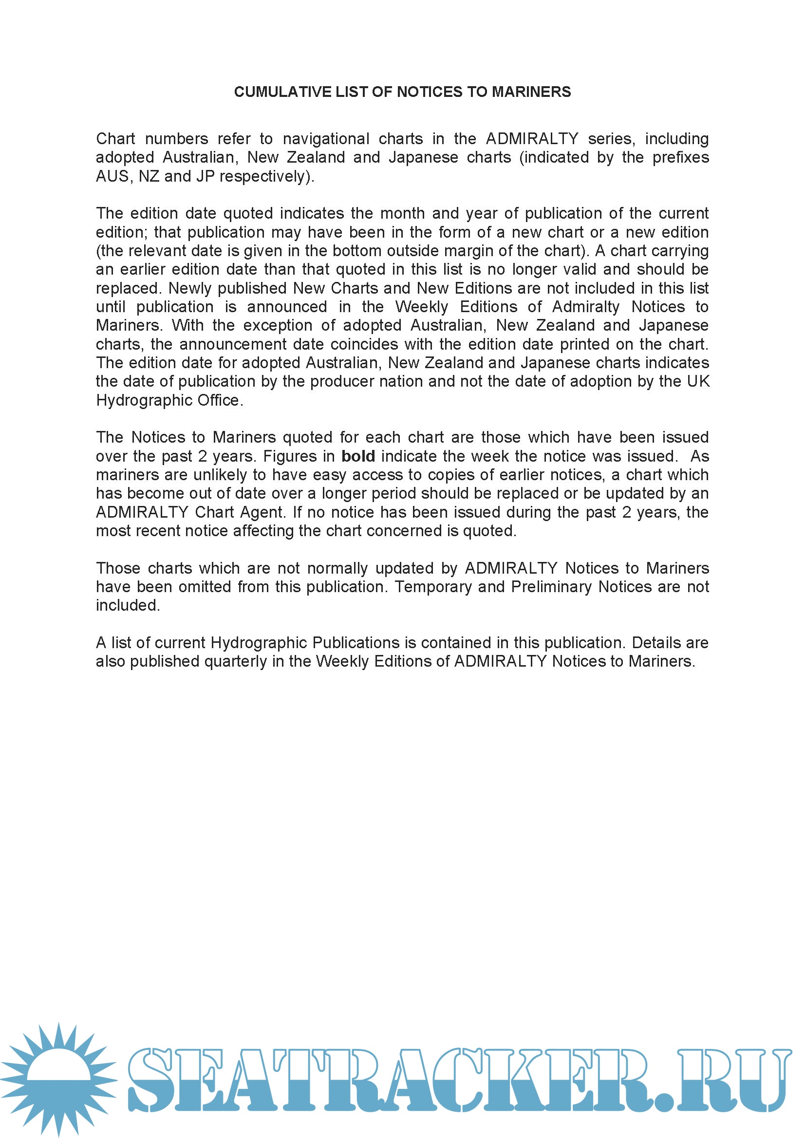 Description: The Cumulative List of ADMIRALTY Notices to Mariners (NP234 A/B) can help you to identify outstanding NMs and audit trails for a particular chart or charts. The list is published annually, with Part A in January and Part B in July.
