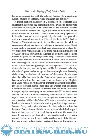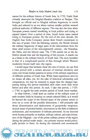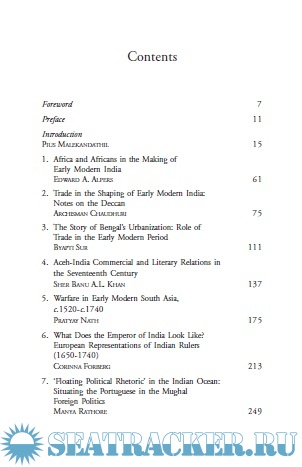 The various papers deal with such themes including interconnectedness between Africa and India, trade and urbanity in Golconda, the changing meanings of urbanization in Bengal, commercial and cultural contact between Aceh and India, changing techniques of warfare, representation of early modern rulers of India in contemporary European paintings, the impact of the Indian Ocean on the foreign policies of the Mughals, the meanings of piracy, labour process in the textile sector, Indo-Ottoman trade, Maratha-French relations, Bible translations and religious polemics, weapon making and the uses of elephants.