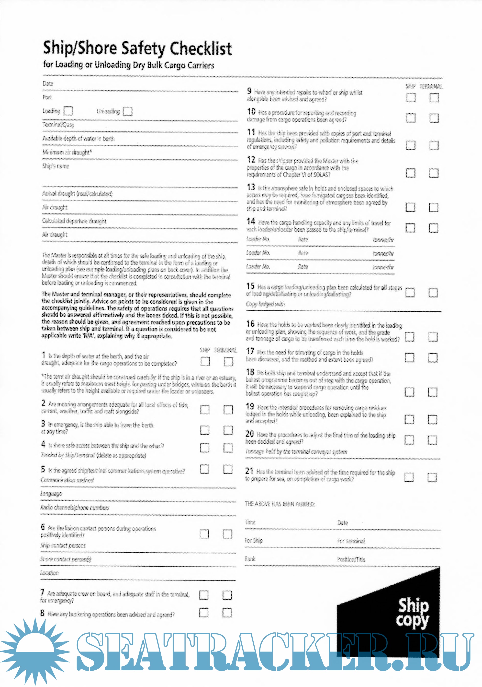 Ship/Shore Safety Checklist for Loading or Unloading Dry Bulk Cargo Carriers