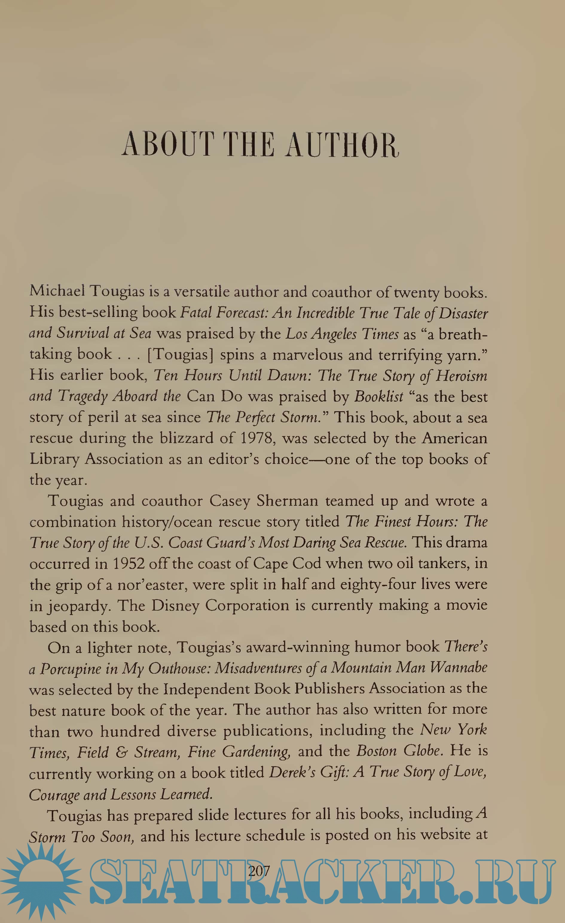 Author Michael J. Tougias, known for his fast- paced writing style and character-driven stories, tells this true saga in the present tense to give the reader a thrilling, edge-of-your-seat immediacy. A Storm Too Soon is Tougias at his masterful best and a heart¬ pounding narrative of survival, the power of the human spirit, and one of the most incredible rescues ever attempted.