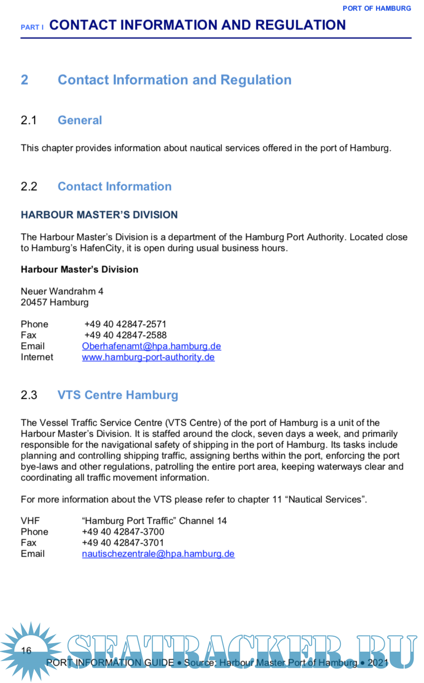 Description: Welcome to the port of Hamburg! Stretching across an area of 87 sq. km, it is one of the largest ports in the world. Our principal responsibility is to ensure the safe passage of every ship both in the port of Hamburg and on its approach channels, and we continuously strive to improve our services.