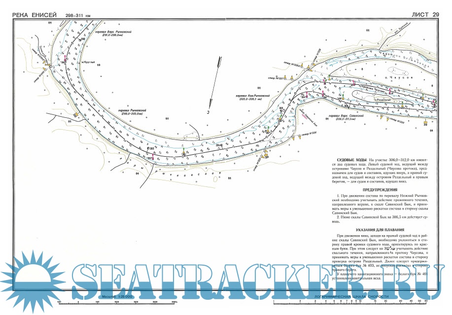 Тексты, помешенные на листах карты, содержат наиболее важные извлечения из действующих Правил плавания по внутренним водным путям РФ и документа «Особенности движения судов по внутренним водным путям Енисейского бассейна», а также рекомендации, направленные на обеспечение безопасности судоходства, и другие полезные для судоводителей лоцийные сведения.