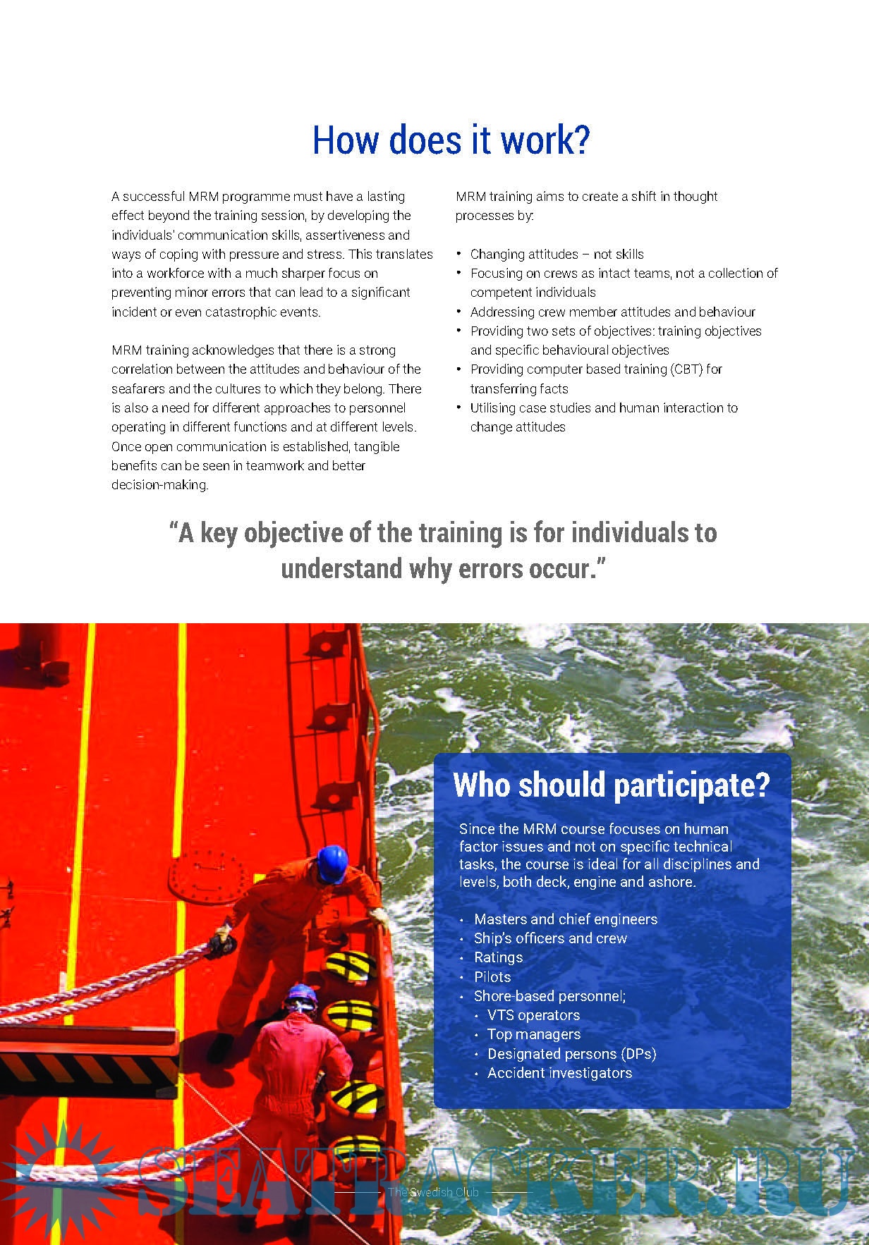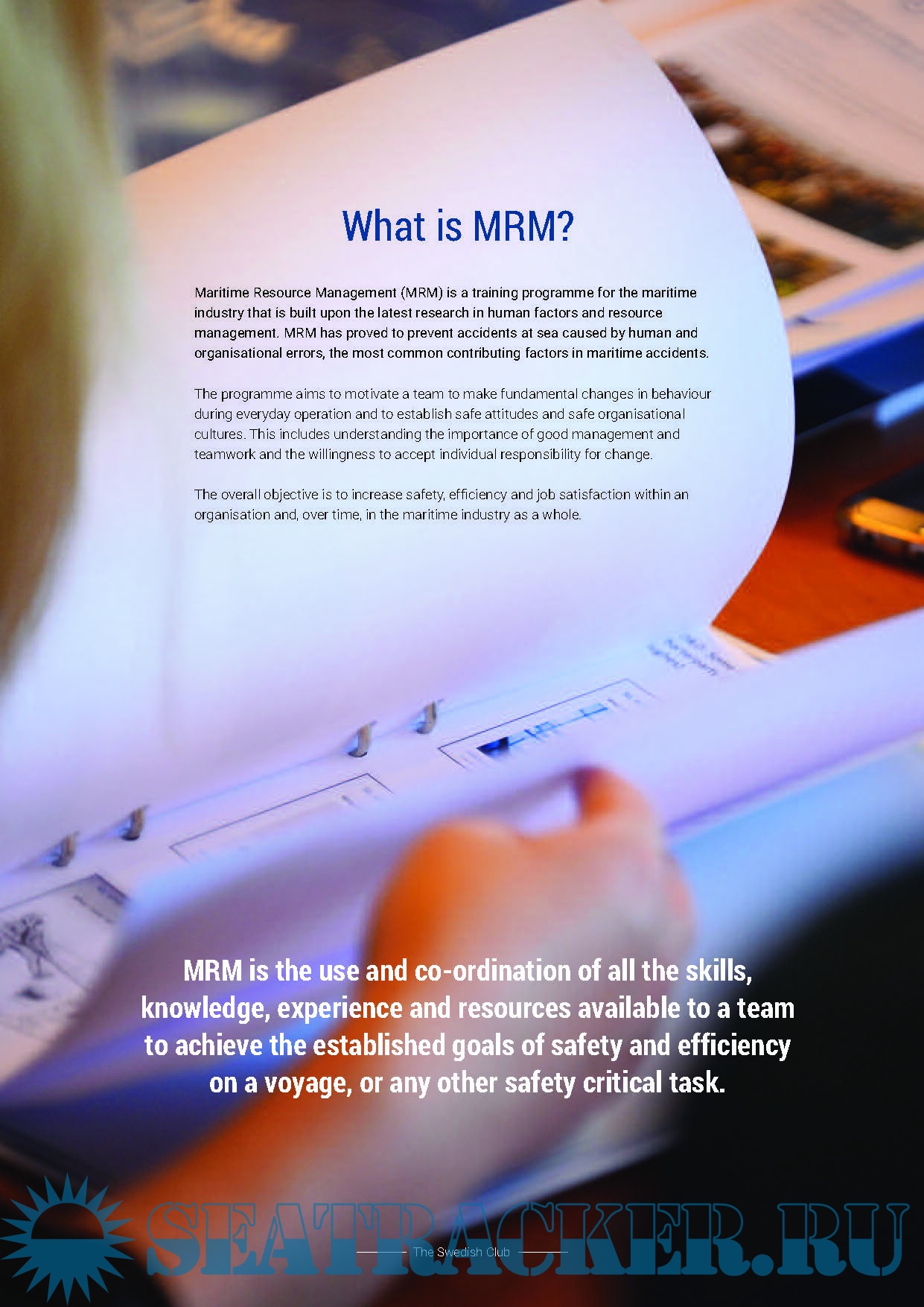 Year: 2021 Language: english Author: the Swedish Club Format: PDF Quality: eBook Pages count: 8 Description: The Swedish Club offers Maritime Resource Management training through The Swedish Club Academy. Maritime Resource Management (MRM) is a training programme for the maritime industry that is built upon the latest research in human factors and resource management. MRM has proved to prevent accidents at sea caused by human and organisational errors, the most common contributing factors in maritime accidents. The overall objective is to increase safety, efficiency and job satisfaction within an organisation and, over time, in the maritime industry as a whole.