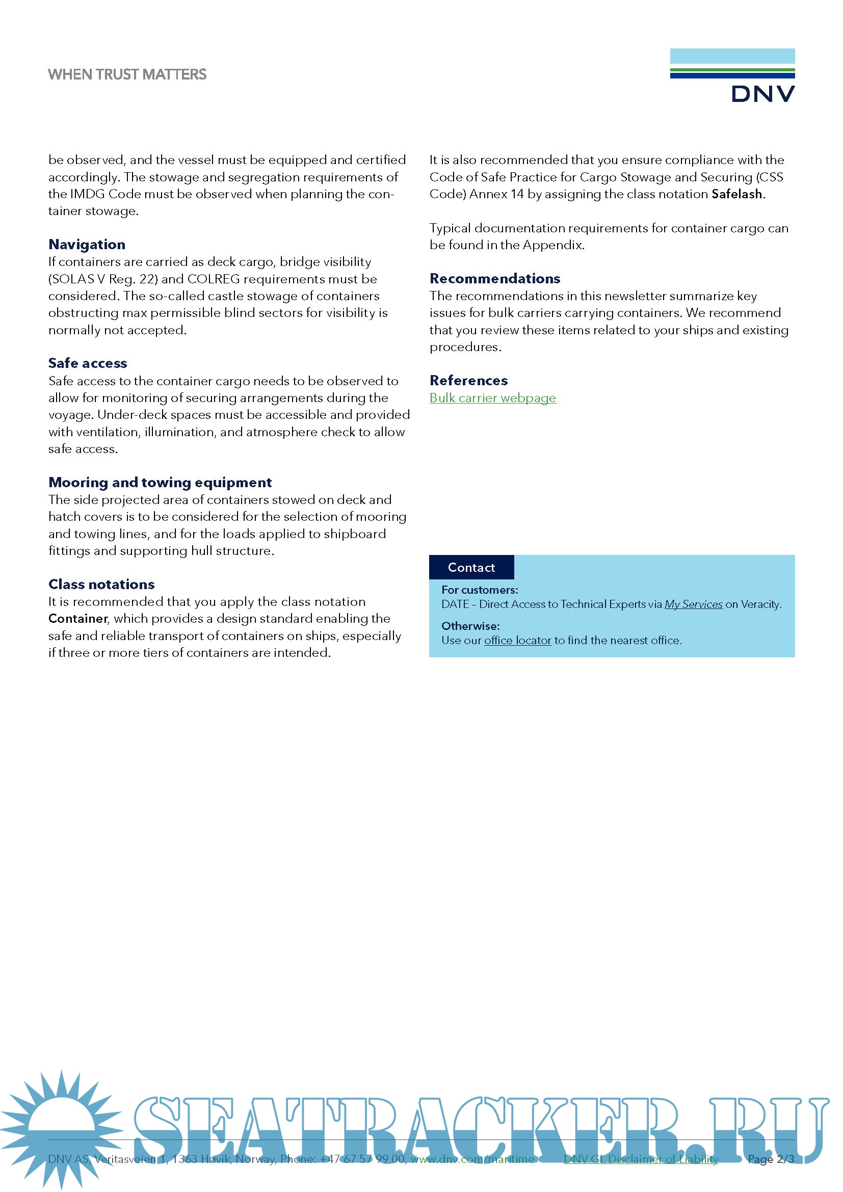 Year: 2021 Language: english Author: DNV Genre: Guide Format: PDF Quality: eBook Pages count: >0 Description: Carriage of containers on bulk carriers is a hot topic, and careful planning and preparation is necessary to ensure the safety of the crew, ship and cargo. This technical news provides you with the relevant information for preparing a bulk carrier for the carriage of containers. Published: 30 September 2021